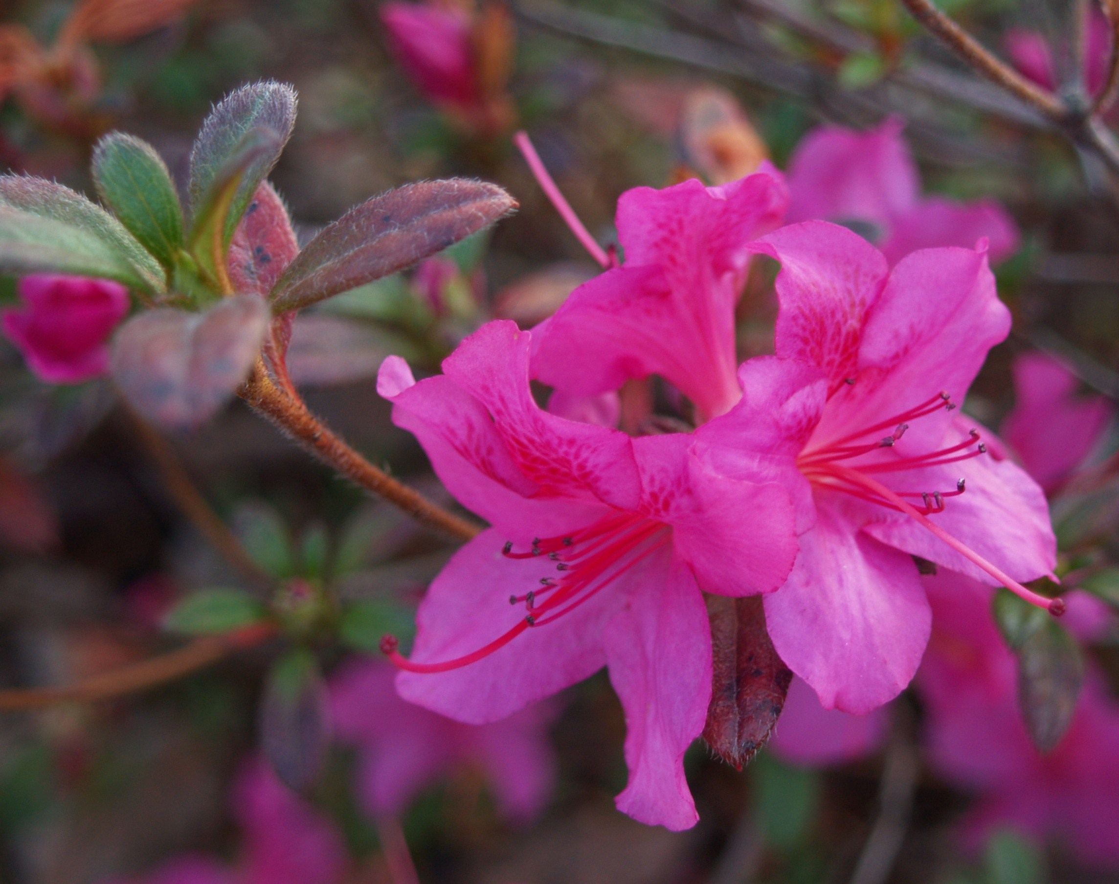The Encore azaleas had weathered repeated frosts through late October and early November at peak bloom, but below thirty degrees the flowers melted. Without extreme nighttime lows since, the numerous remaining buds have begun to open, and though the azaleas will bloom only sporadically, their color is welcomed.