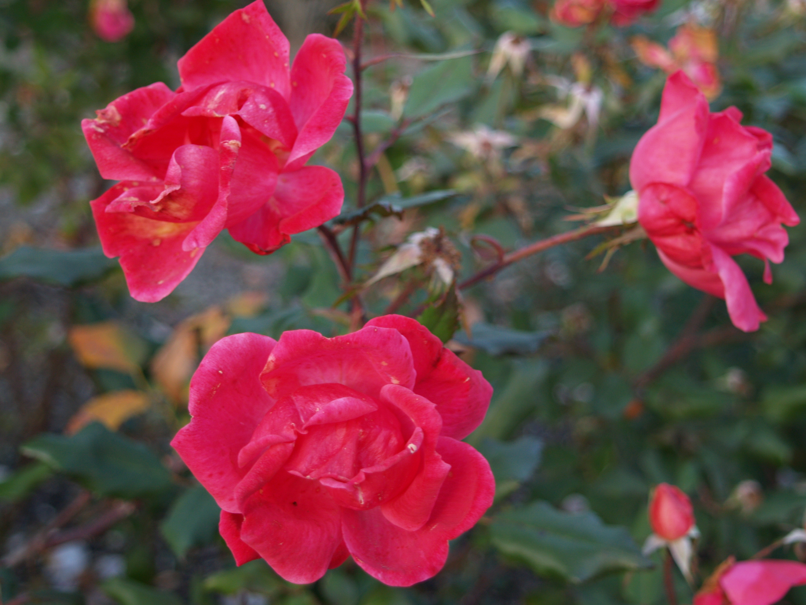 The Knockout roses, pink and red (below), continue to bloom, though the flowers are more ragged than in warmer times. The edges of each bloom are injured and misshapen, but from a distance, even from a few paces away, the damage is not evident. The yellow Knockout quit blooming weeks ago. I don’t know if this variety will be early to quit in autumn, or if the lack of blooms is due to its relatively new planting.