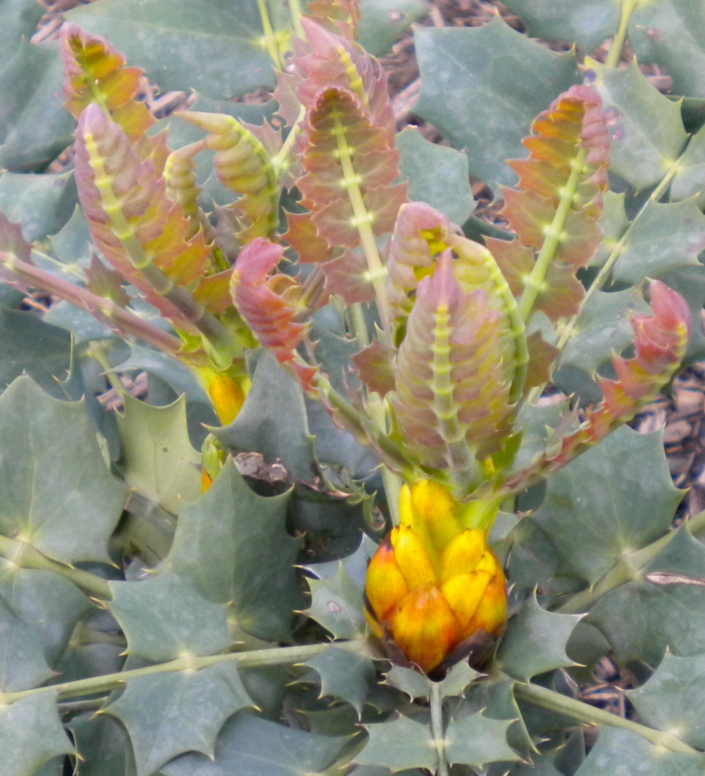 I too had been enjoying the beautiful tall plume-y stalks of bright yellow on my Winter Sun cheerily greeting me first thing every morning when I looked out of my walk-out bay. Then, suddenly 2 mornings ago there were no beautiful bright yellow flower racemes to greet me! I went out to investigate, and, sure enough, the deer had got them! You can see where the deer attempted to nibble on the leaves (just small bites) and gave up; but, apparently the flowers were nice and tender to their liking, and, all that is left of each raceme is about a 1″ (to 2″) stub. Next year I think I will cover the flowers with deer netting. I purposely had planted this Mahonia about 3 years ago in a location where deer had chomped away on the previous new evergreen shrub I had attempted there, KNOWING the deer wouldn’t get the Mahonia. Who would have thunk??!!!