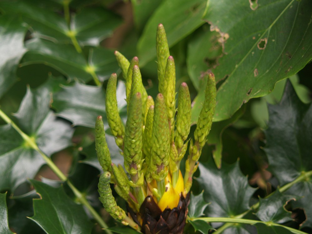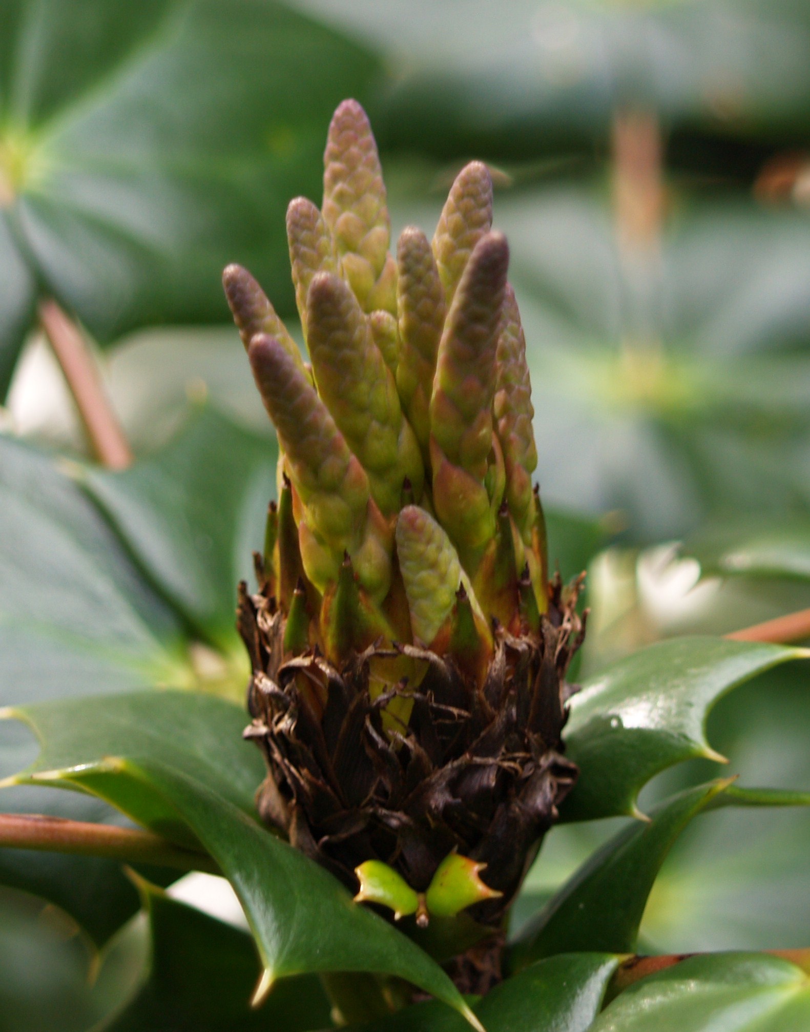 My ramblings through the garden always include a stop at one of the many mahonias to check out what’s happening that day. The compact (for a mahonia) growth habit and dark green, spiny evergreen leaves are nice enough, though I’ve cursed ‘Winter Sun’ a time or two stepping on a dead leaf when barefooting through the garden.