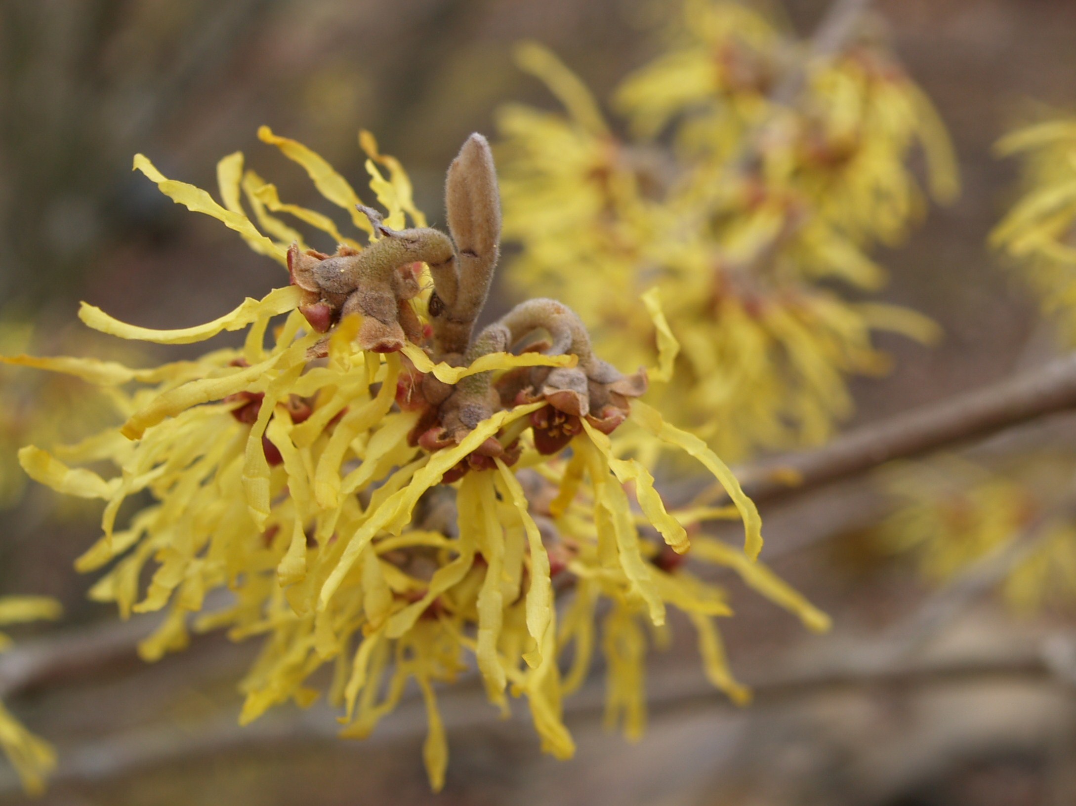 On this snowy Saturday in December the February blooms of hellebores (above) and witch hazel (below) seem so far away, but what better time, now that the darkness has hidden winter’s beauty, to recall delights that are no more than two months ahead.