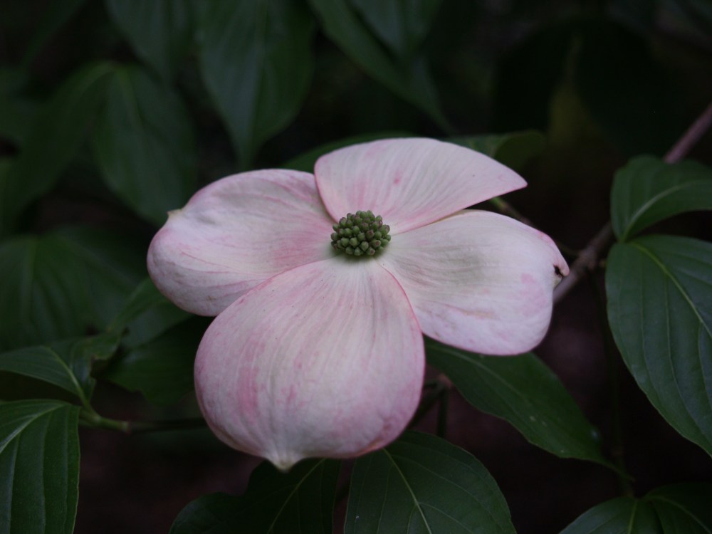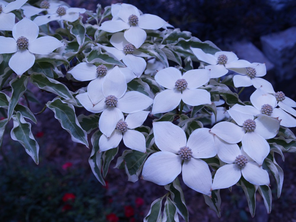 There are two variegated leaf Chinese dogwoods in the garden, ‘Samaritan’ and ‘Wolf Eyes’ (above), and though the coloration of their foliage is a similar green with white edges, the trees are quite different. Samaritan has an upright habit, fortunate since I have planted it planning to eventually walk under its branches, and has been reluctant to bloom in my garden. Each year there are a branch or two with leaves that are pure white with no green, but no flowers, and now that I have proclaimed that it will never bloom I suspect that next year it will be covered.