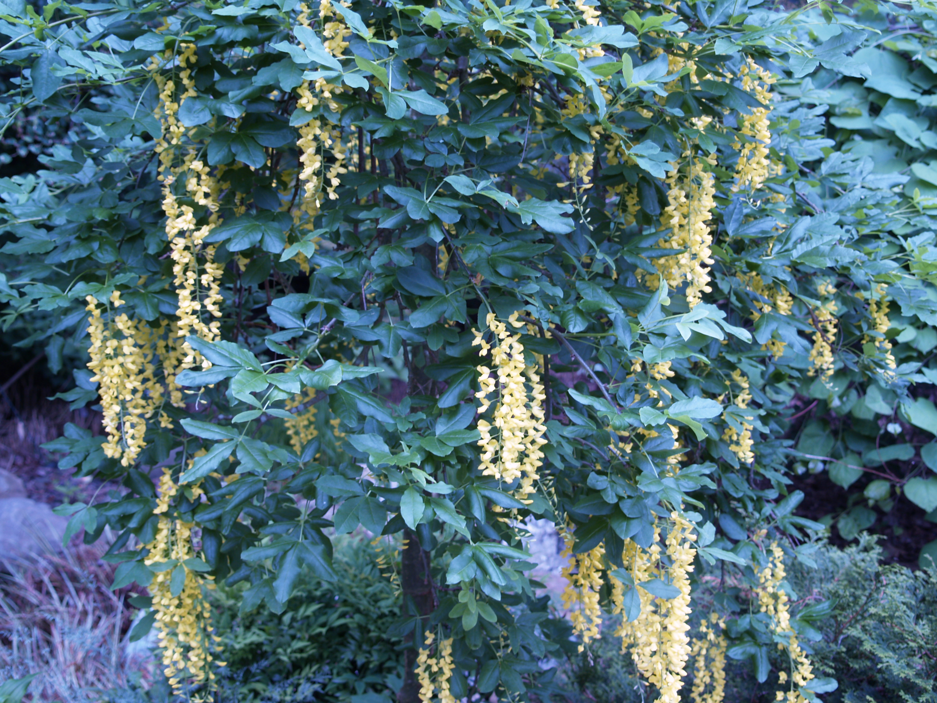 Only a few days ago I whined that the golden chain tree (Laburnum) does not perform well in my Virginia garden despite a favored position to protect it from the late afternoon sun. The sparse foliage and meager blooms  in a photograph substantiated my claim that this European native is poorly adapted to the heat and humidity of the eastern United States. Though it barely manages to survive I keep this weeping form of golden chain around for its novelty.