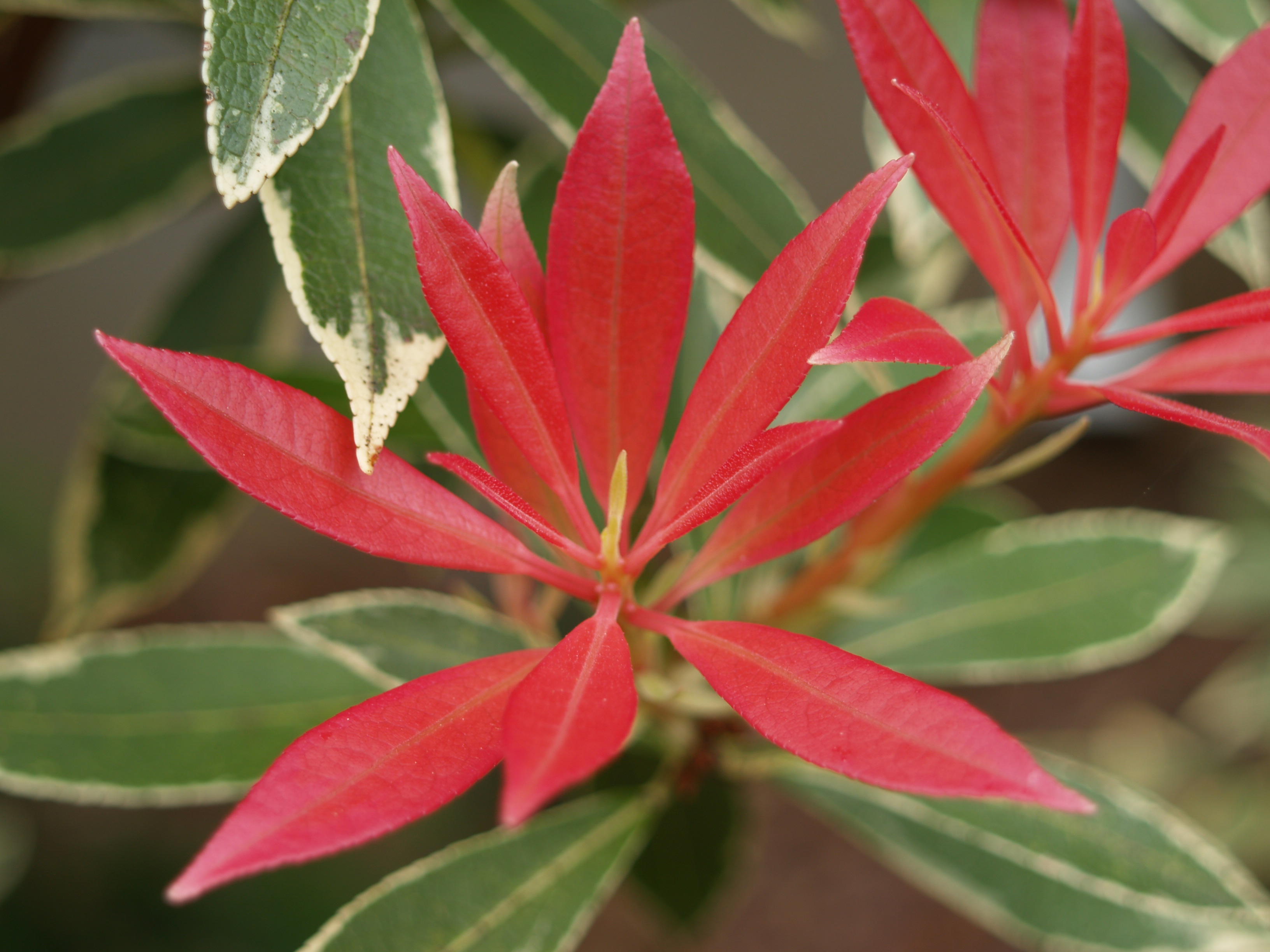 In sun or shade andromeda, or Japanese pieris (Pieris japonica) is a wonderful choice if allowed a position with medium moisture, not too dry or wet as pieris is sensitive to both. The red spring growth of common varieties such as Mountain Fire, and long pendulous panicles of early spring blooms make this a splendid deer resistant evergreen shrub. Variegated pieris, and a more vigorous selection, ‘Flaming Silver’ (above and background of title) add colorful variegated foliage, and red to pink new growth, though I have found this cultivar more susceptible to lacebug than others.