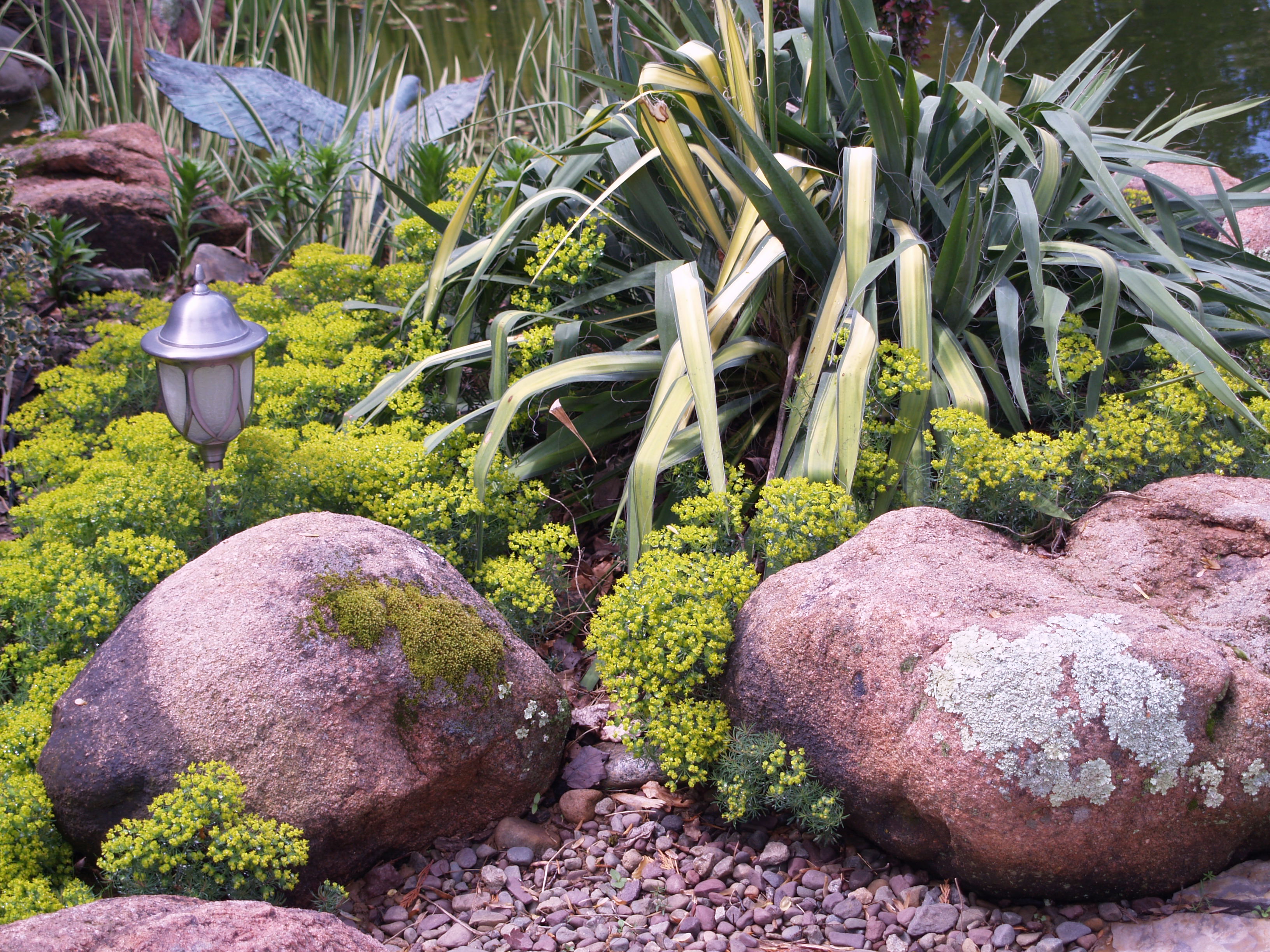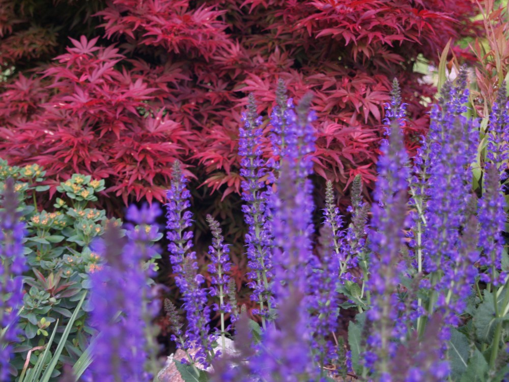The design of this garden is dictated by feel. Sometimes I “feel” that a yellow-leafed, knee high must be planted between the red-leaf Japanese maple and the blue spruce with pendulous branches that hug the ground, and what pops up in a walk through the garden center, a red leafed euphorbia (Bonfire euphorbia, above) with chartreuse bracts that stand out like a neon sign. Perhaps the euphorbia doesn’t quite work with ‘Caramel’ heuchera only a few feet away, but to my eye the red, yellow, blue combination is so splendid that I will overlook the heuchera, and instead consider that it belongs in the grouping with red hot poker and fall blooming toad lilies with the large green leaves of oakleaf hydrangea close behind.