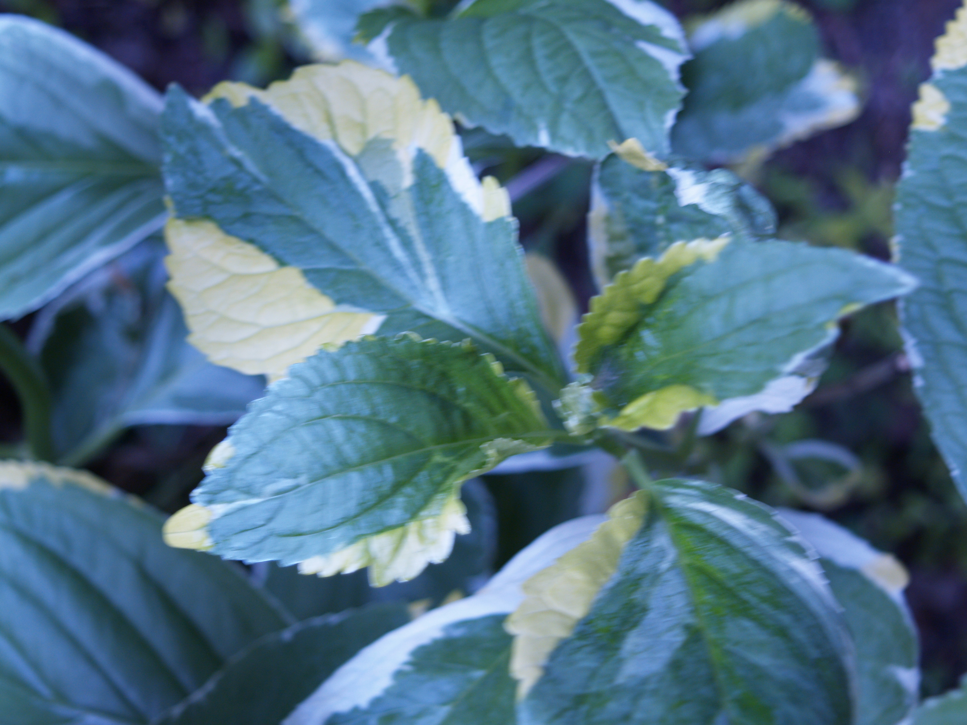 There are yellow and variegated caryopteris, the nearly black leaves of Black Lace elderberry and Diabolo ninebark, hydrangea ‘Lemon Daddy’, with large yellow leaves and blue flowers, and a couple variegated hydrangeas (above) that rarely bloom with winter dieback to branch tips, but with the foliage that is worthy enough not to be bothered by the lack of blooms.