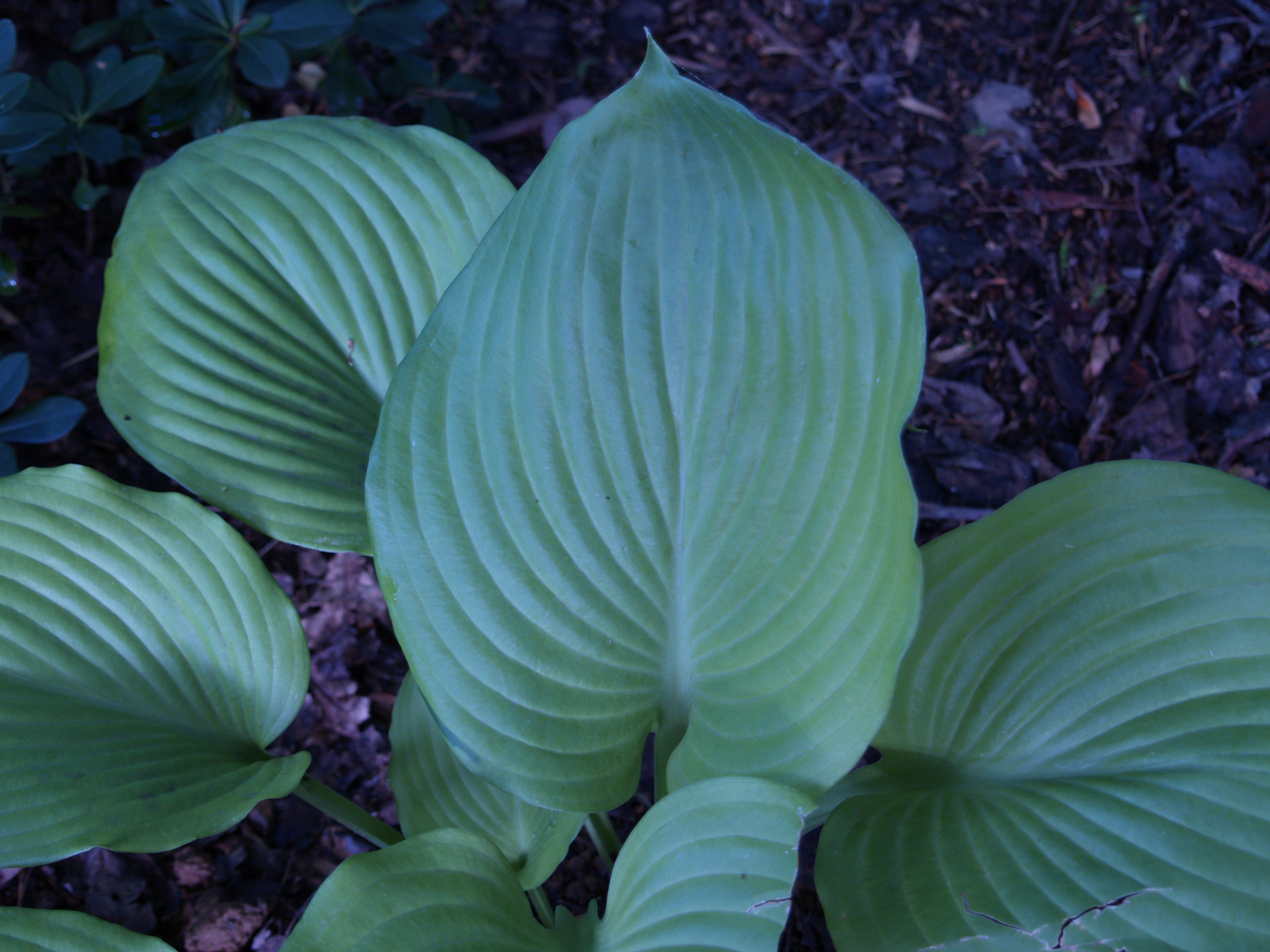 Blooms are a month away for most hostas, and few are selected for their flowers, so today I will address primarily foliage, and there are no leaves  grander than those of ‘Sum and Substance’ (above) and ‘Sieboldiana Elegans’ (below). Large leafed hostas seem to be more resistant to deer, and the chartreuse leaves of Sum and Substance can grow to nearly two feet in length, and clumps can reach six feet across, a commanding presence in the the shady garden.