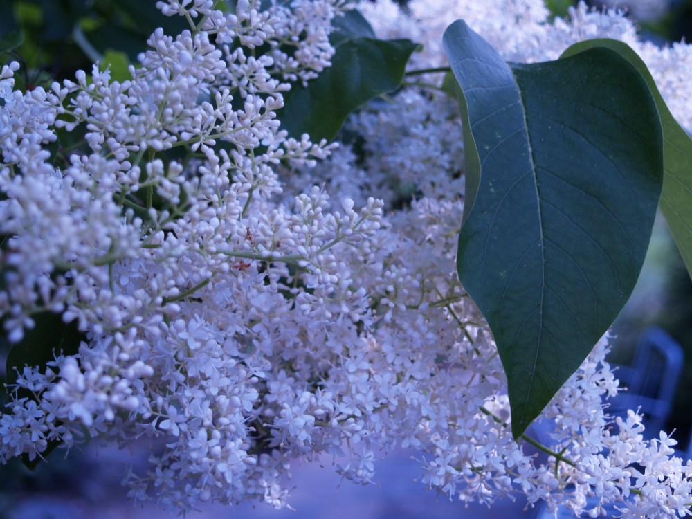 ‘Ivory Silk’, the tree lilac (Syringa reticulata ‘Ivory Silk, below), is past its peak with white blooms littering the ground beneath like snowflakes, though they quickly spoil and turn a muddy brown. The stone path that winds under the tree, then descends to the lower patio, is treacherous with a slippery covering of damp flowers. On the far side of the patio the Chinese dogwood (Cornus kousa) is also past bloom, a bit early since they often remain in flower into the middle of June.