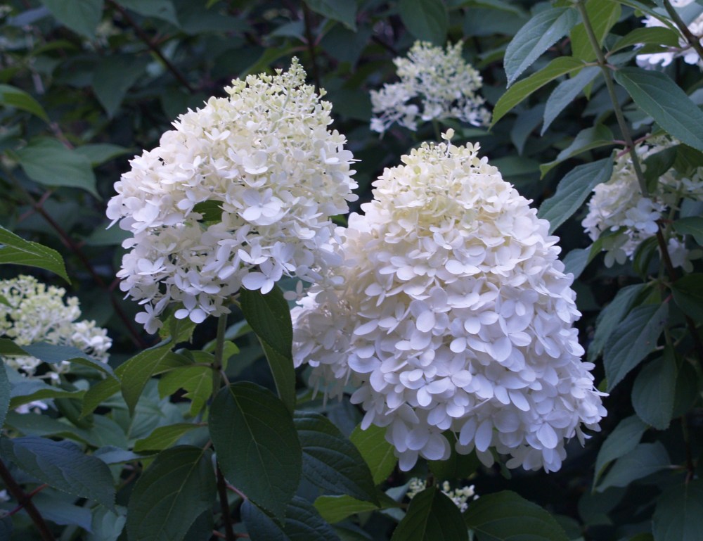 The panicle hydrangeas, Tardiva and Limelight, are beginning to bloom and show no signs of heat related problems. They will be in peak bloom by late in July, with flowers lasting into September. Hydrangeas, both panicled and bigleaf (and Oakleaf, now past bloom), are wonderful shrubs for the summer garden, consistently lush and colorful, pest resistant and requiring an absolute minimum of care.