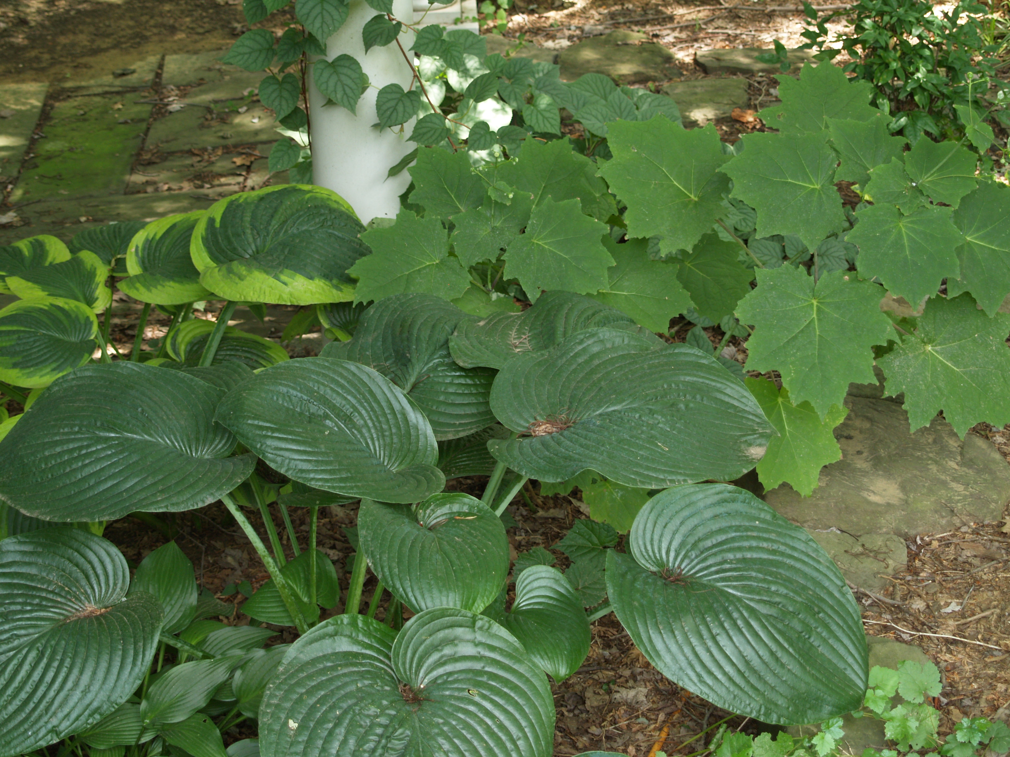 The largest of hosta leaves (above) are well over a foot wide, and varieties such as Sum and Substance and Big Daddy make a considerable clump after a few years, and tend to be more resistant to deer than others. I have planted so many in the garden that I’ve forgotten the names of most, but I enjoy them all, even as they flop over and block the garden paths.