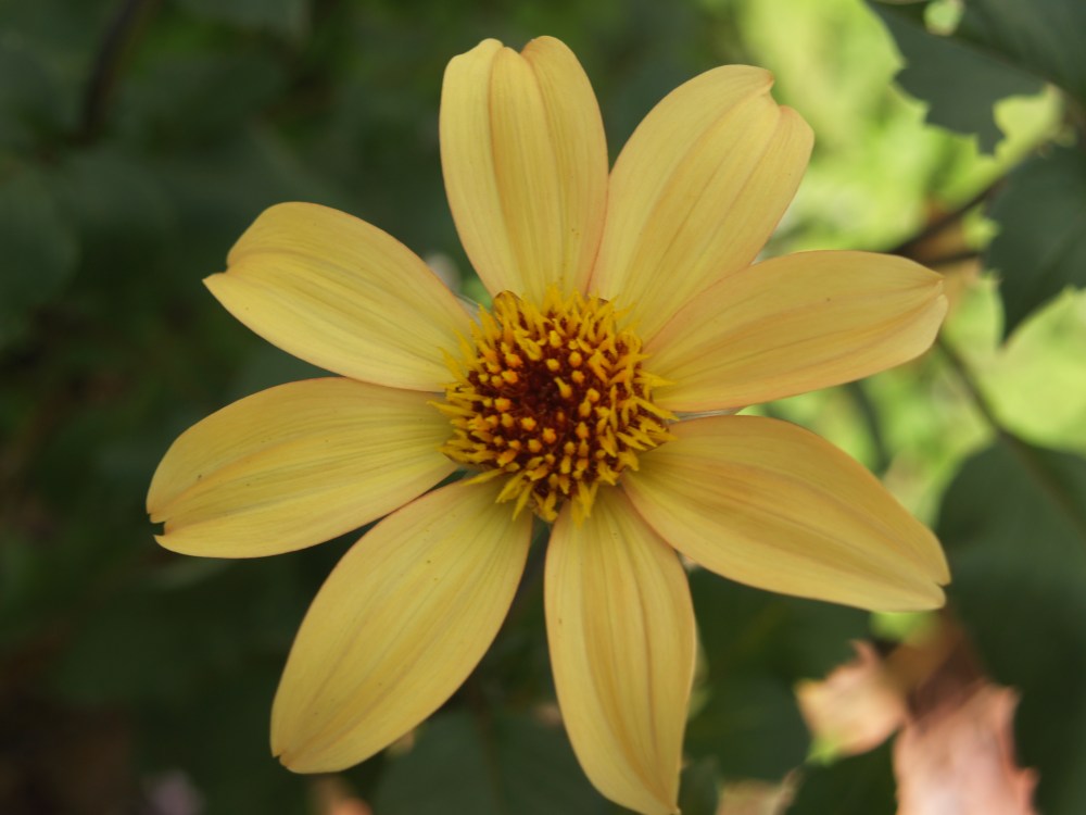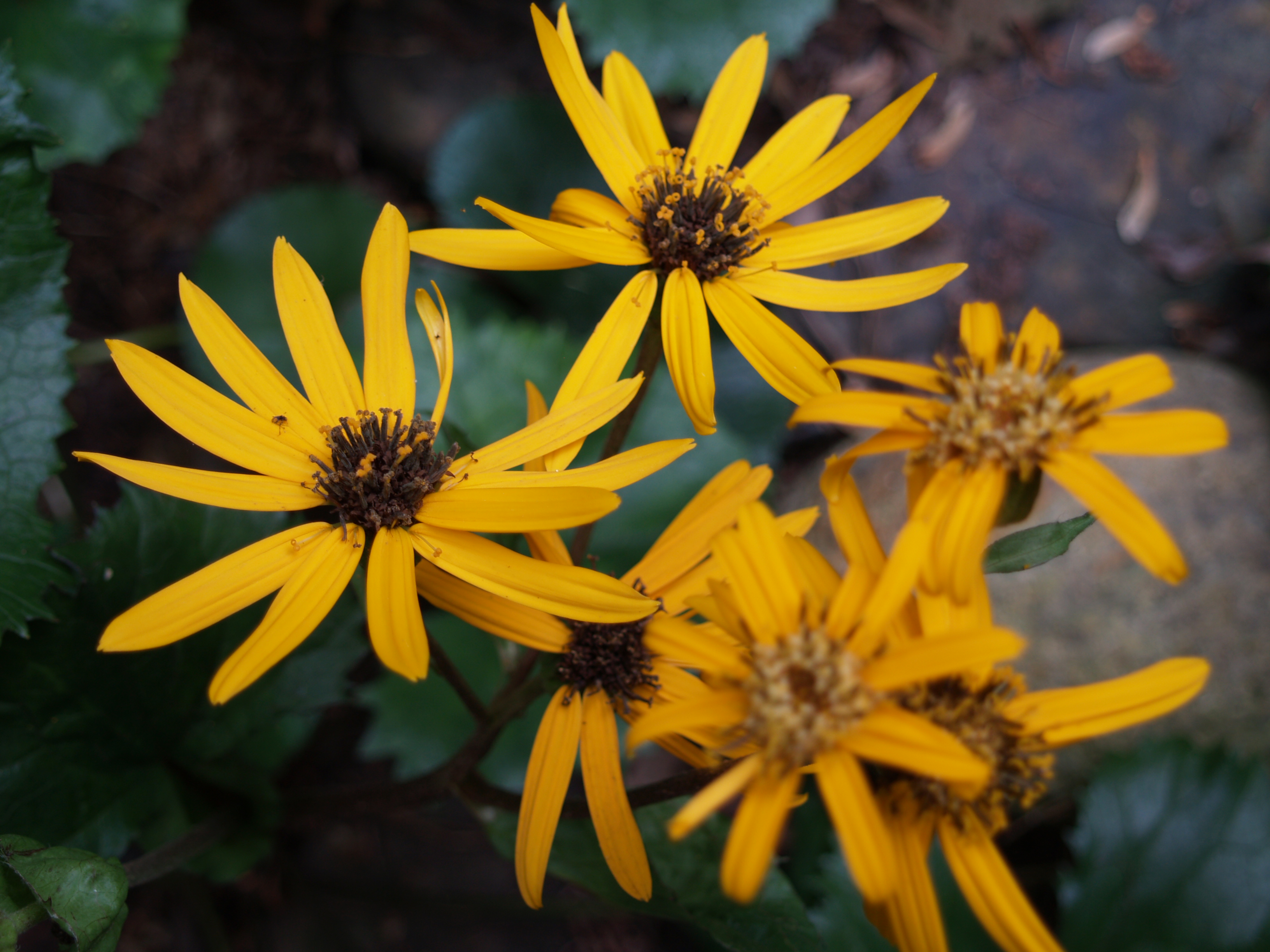Across a stone path, perched at the edge of a pond, but tucked beneath the winding branches of a weeping blue atlas cedar, the Leopard plant (Ligularia dentata ‘Othello’, above) prefers more sun, but has managed quite well with very little. In sunnier spots Leopard plant will often wilt in the afternoon sun, but it does not suffer this problem under the cedar. The bright yellow blooms dependably appear at the start of each September.