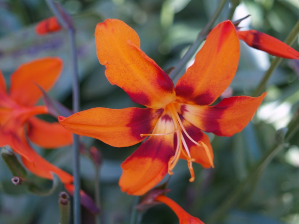 The sword-like foliage of Crocosmia ‘Emily McKenzie’ (above) flops over the fading stems of the Asiatic lilies, and it has begun to bloom, more than a month later and with longer lasting flowers than the more common ‘Lucifer’. The earlier, scarlet-red Lucifer has been overwhelmed by neighbors, but Emily McKenzie was given a more favorable location with a bit of space to spread at the edge of the swimming pond.