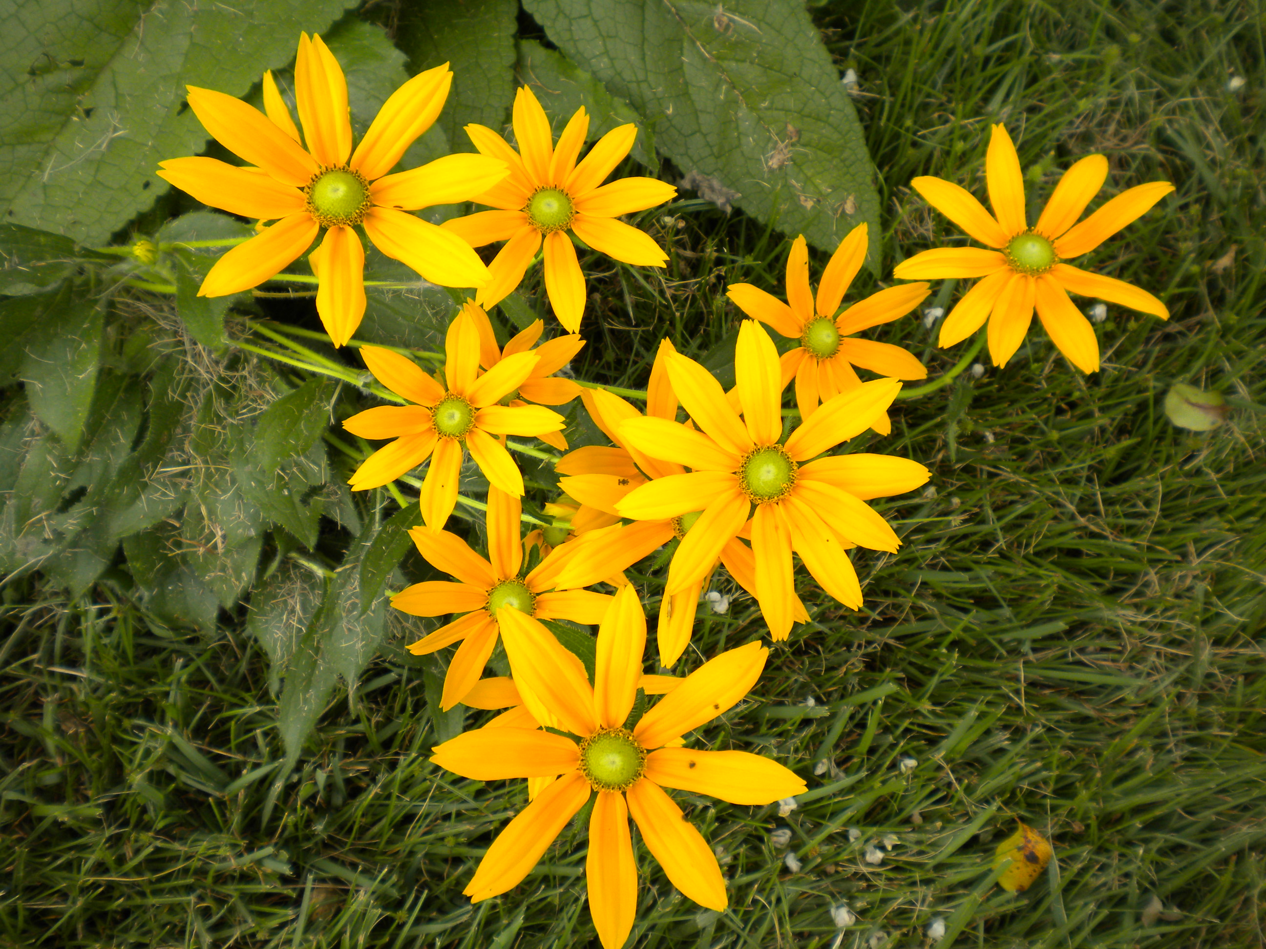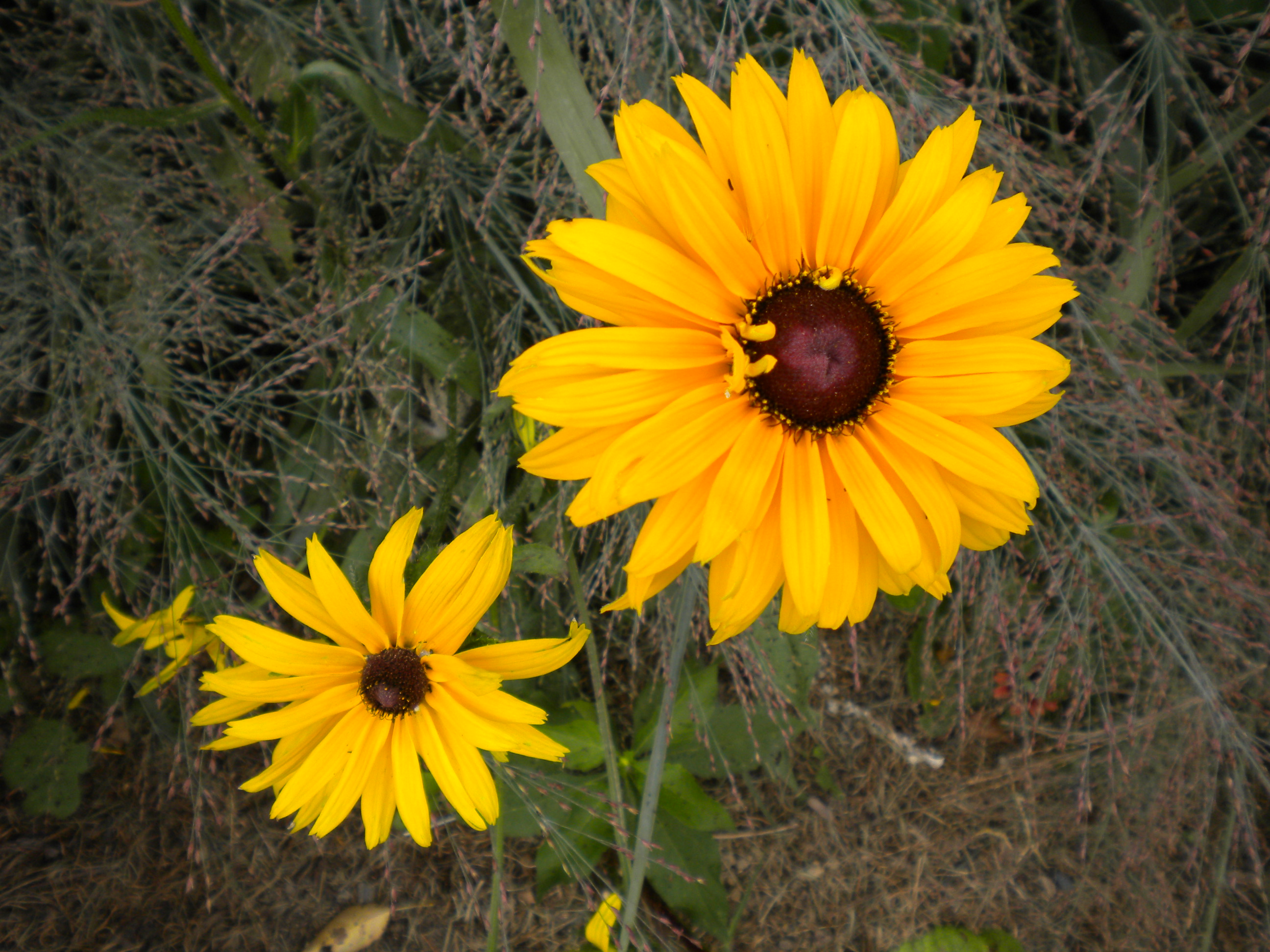 Late blooming coneflowers and sunflowers flop about in their full glory, planted between tall grasses.