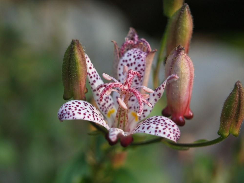 There are a handful of toad lily cultivars in the garden, and none have behaved as expected. Only one bloomed by the first of September, with the others delayed until late in the month, and then the buds of ‘Miyazaki’ and ‘Samurai’ have opened all at one time, rather than progressing from top to bottom along the arching stems as usual. ‘Sinonome’, ‘Gilt Edge’, and one other (whose name I can’t recall) have numerous buds that will bloom over the next weeks so long as we avoid a frost or freeze.