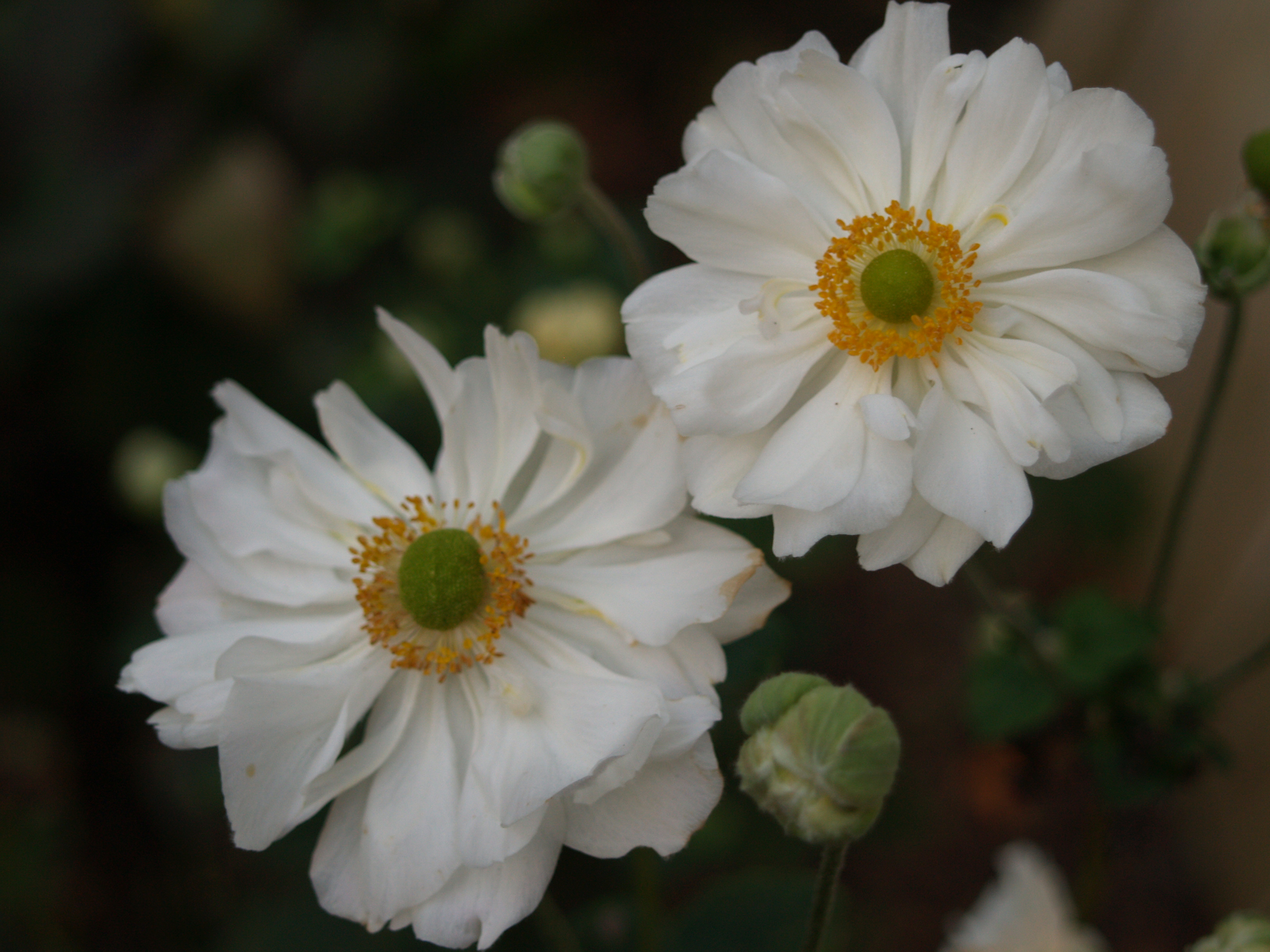 The Japanese windflowers are in full bloom now, and I hesitate to say that they were delayed in bloom since I can recall that the pink ‘September Charm’ (Anemone ‘September Charm’, above) did not bloom at all in September a year ago. ‘Whirlwind’ (below) suffered a bit of damage to the foliage from the drought, a little crispy around the edges, and is perhaps a little floppier than usual, but is blooming and happy with the recent rain and cooler temperatures.