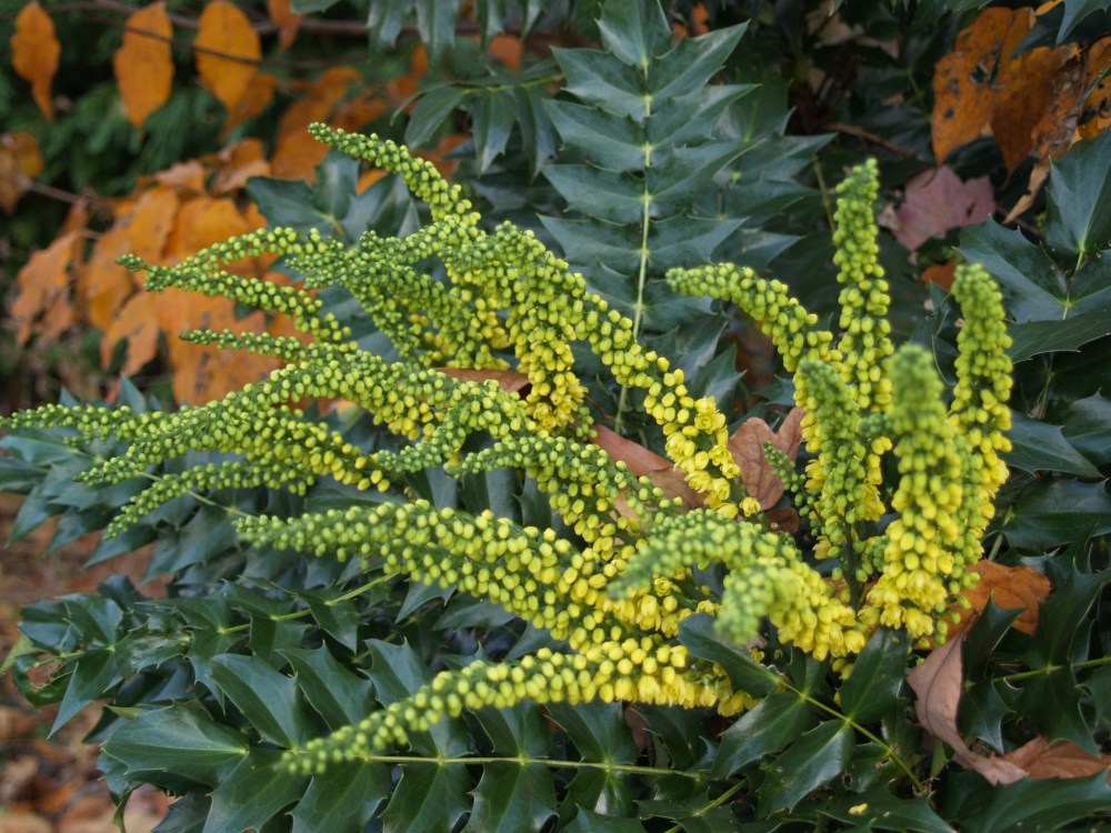 The first blooms of witch hazel in February are a bright, cheery yellow, and the last flowers of the year from ‘Winter Sun’ mahonia (Mahonia x media ‘Winter Sun’, below) are quite similar in color. The spikes of small yellow blooms arch from the branch tips, beginning to bloom early in November and often persisting into early January, unbothered by severe weather. The blooms are followed in late winter by small, grape-like fruits which are quickly consumed by birds when ripe.
