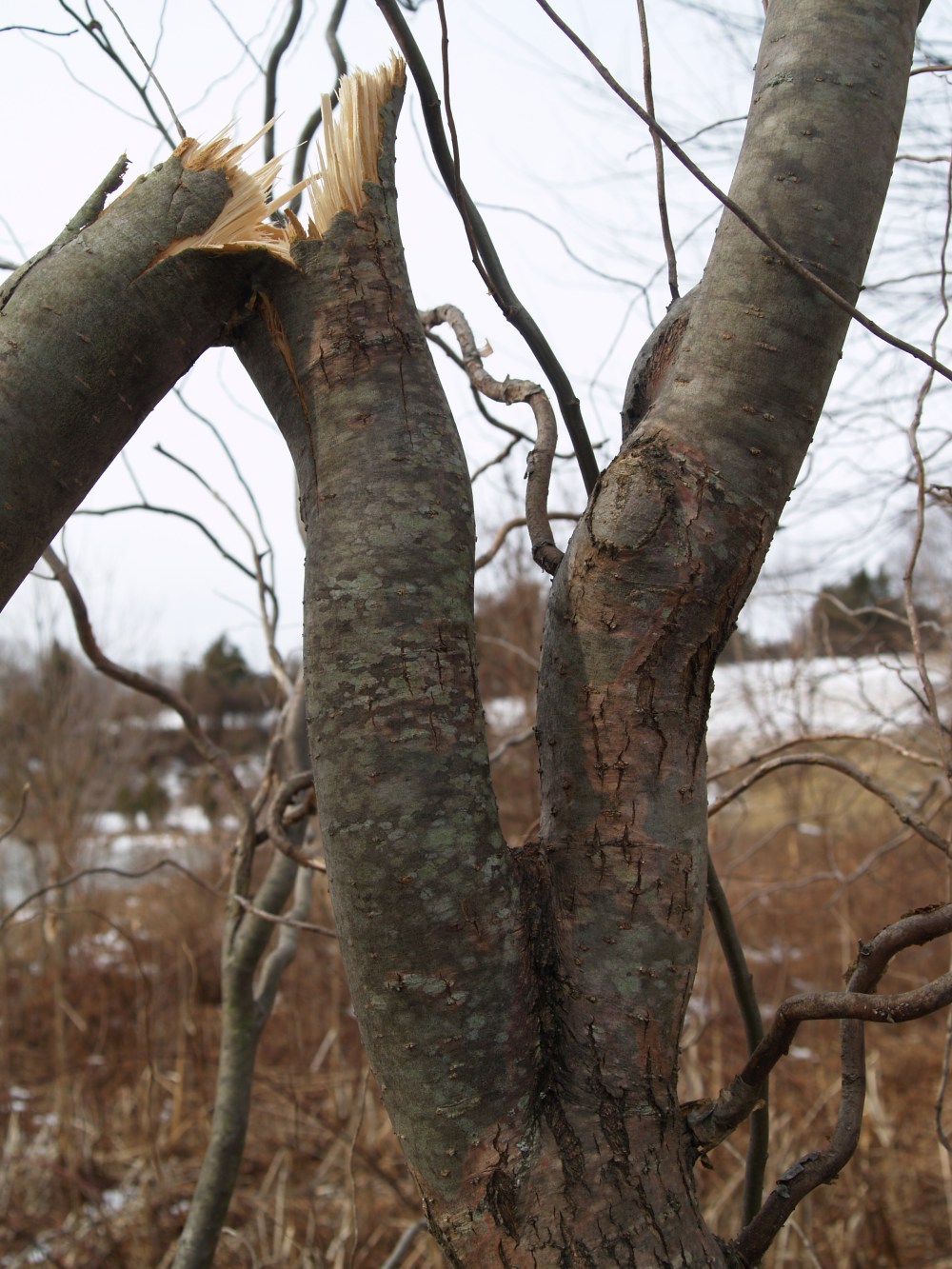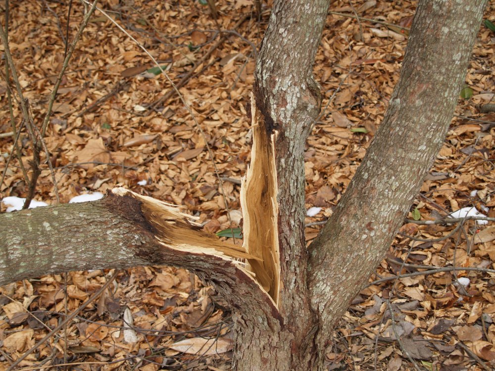 As heavy, wet snow accumulated on the thickly branched red maple at the edge of my neighbor’s property, the Y-shaped junction where the tree forked into two trunks was severely stressed. Finally, the weight of snow was too great and half of the snow covered maple tumbled over, its fall broken only by a large dogwood just below the kitchen window. Fortunately, the tree was planted so that it did not fall into the house, but the following day it was apparent that the tree must be cut down.