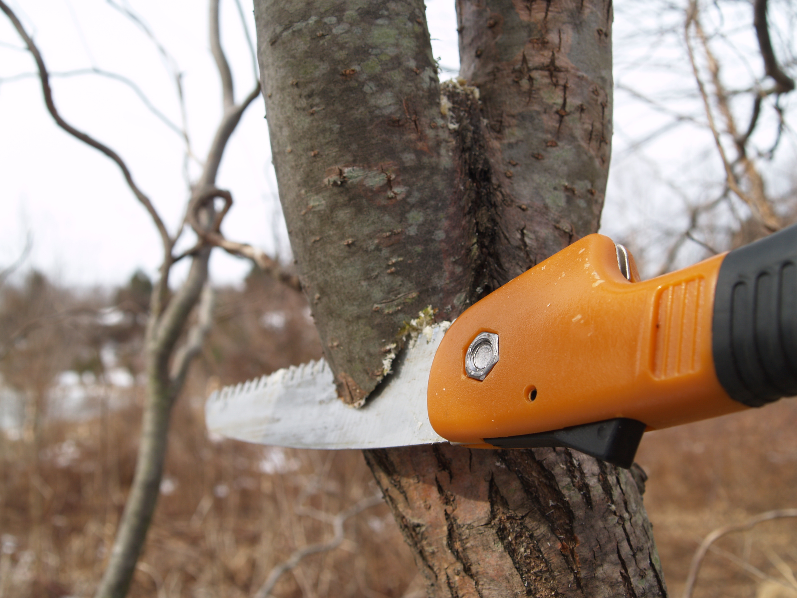 Most of the repairs that I’ve accomplished on damaged trees in my garden today have been done with a folding pruning saw, a low cost tool with coarse teeth that cut easily through tree branches. A chain saw was used to cut large branches into sections, and hand pruners were used to clean up loose wood around the cuts.