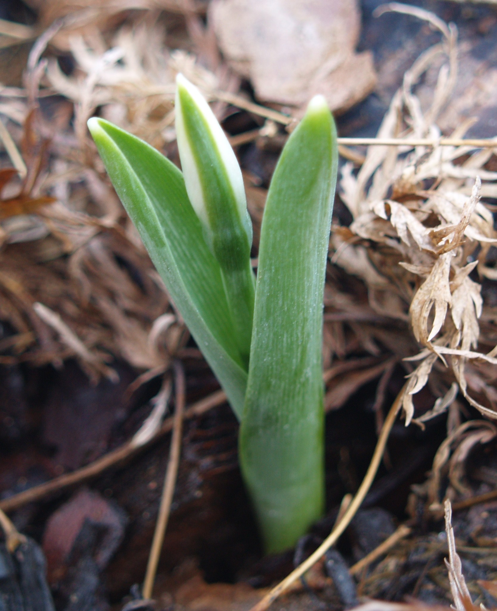 A few warm days in February set the heart aflutter with anticipation of spring, and a week ago I heard from a gardener in town who is celebrating the arrival of the first snowdrops and hellebores. In years past I have seen snowdrops poke their heads above an inch or two of fresh snow, but the snow along my shady front walk was hard crusted and icy until a few days ago and has slowed their progression. With the snow melted, the snowdrops are sprouting quickly (below), and I expect blooms within the next week.