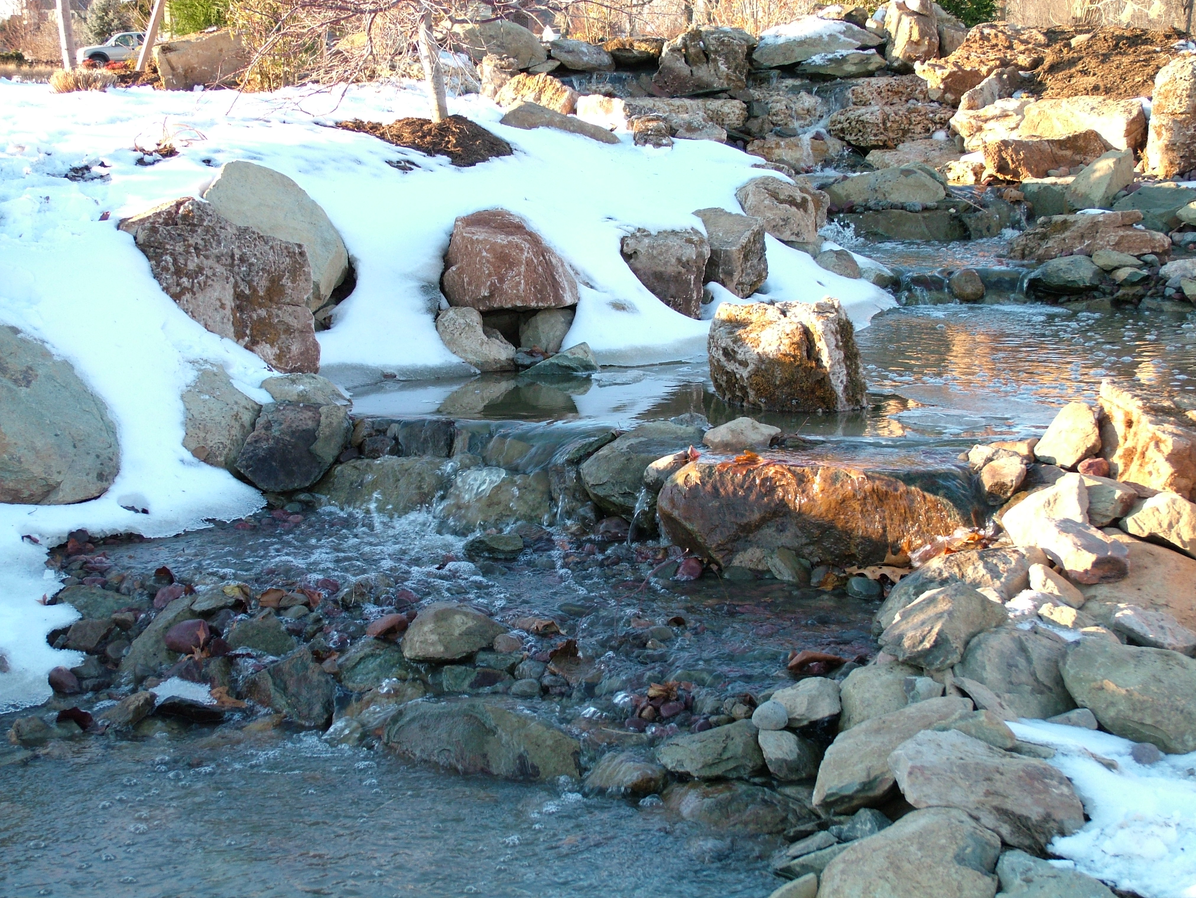 I leave my ponds running through the winter. Moving water doesn’t freeze, and pumps are not harmed. In more northern states ponds must be shut down so that freezing water circulated into warmer, deeper water doesn’t harm fish, but in the mid-Atlantic region this isn’t a problem. If you have fish in your pond, and decide to turn it off for the winter, you’ll need to run a small pump to keep an area open so that harmful gases can escape, or use one of the small pond heaters that keeps a small area from freezing.