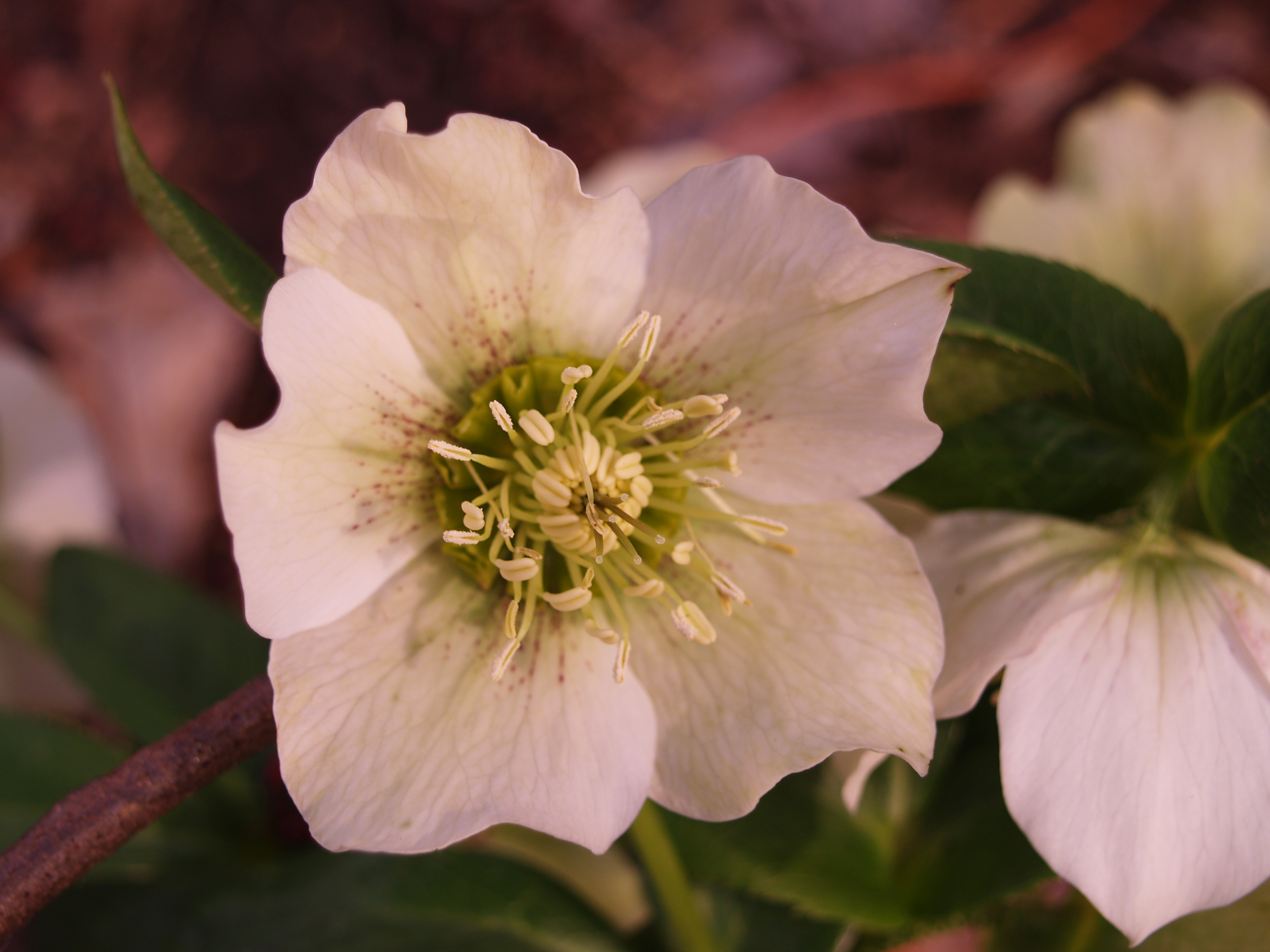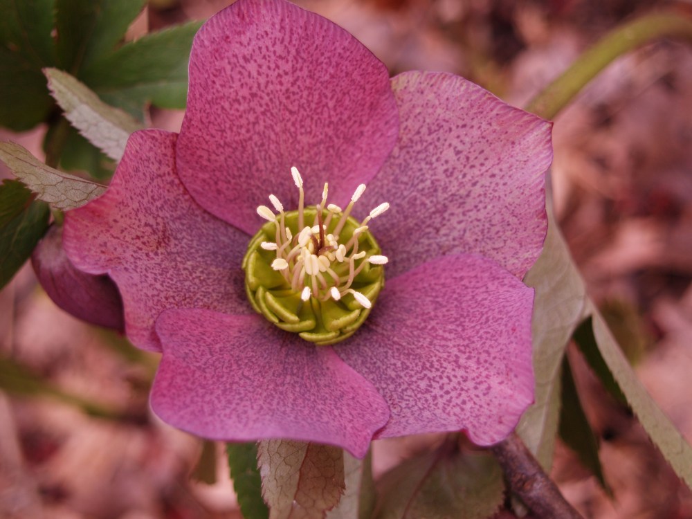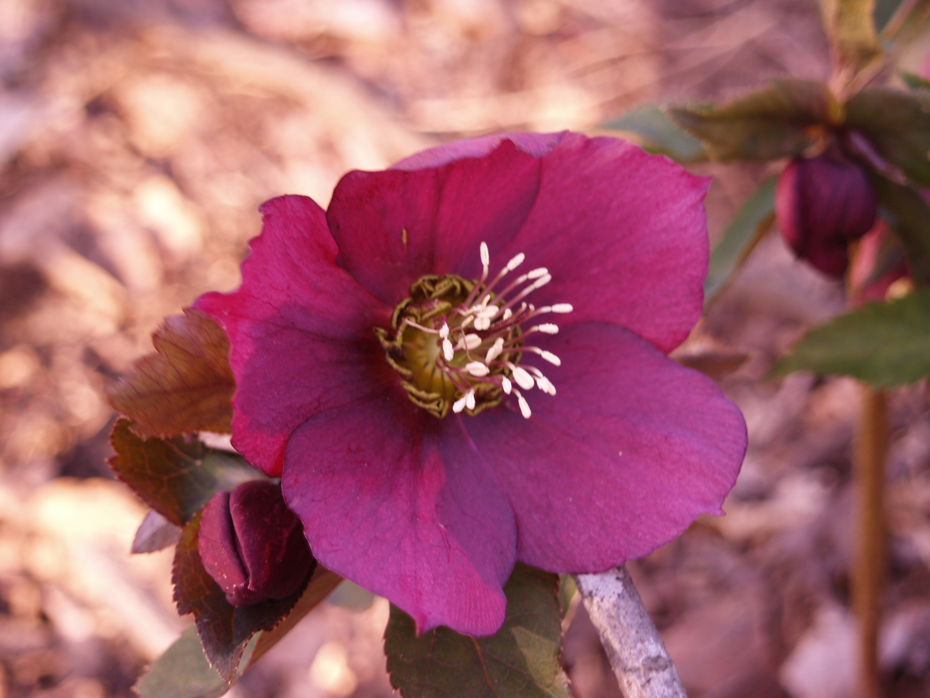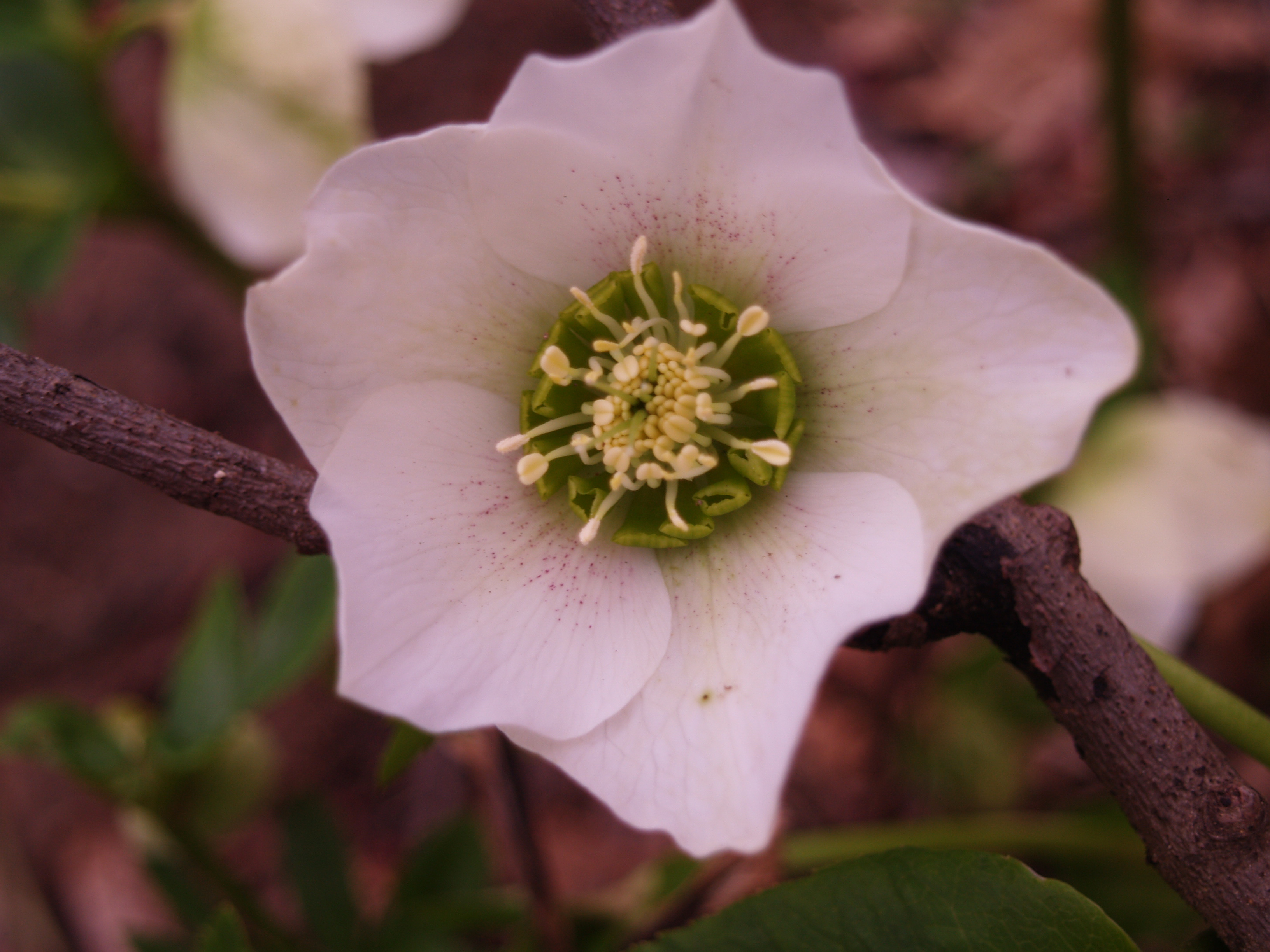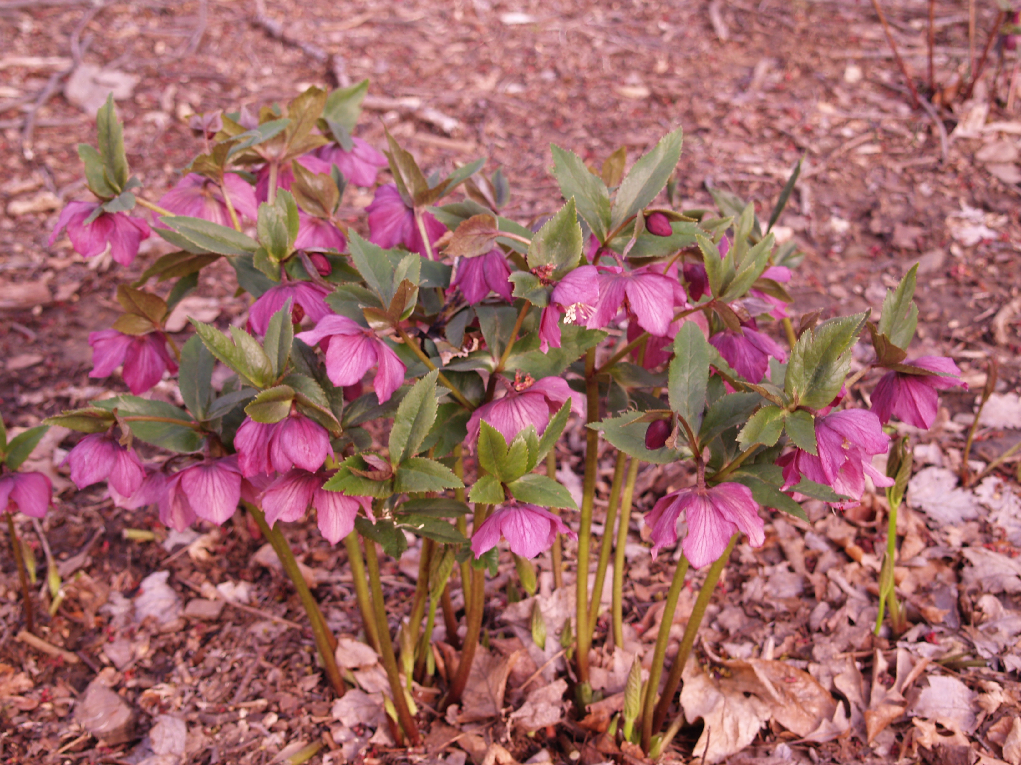 In mid-February the dull monotony of the winter garden is broken by blooming witch hazels, then snowdrops, crocus, iris, narcissus, and hellebores. Witch hazels bloom on bare stems, and of course the bulbs do not have woody stems at all. Hellebores are low growing, shrub-like perennials with evergreen foliage, though by late winter it is often weathered and tattered. Flower buds slowly emerge from the cold earth early in February, and by late in the month a few blooms will open in my shaded garden.