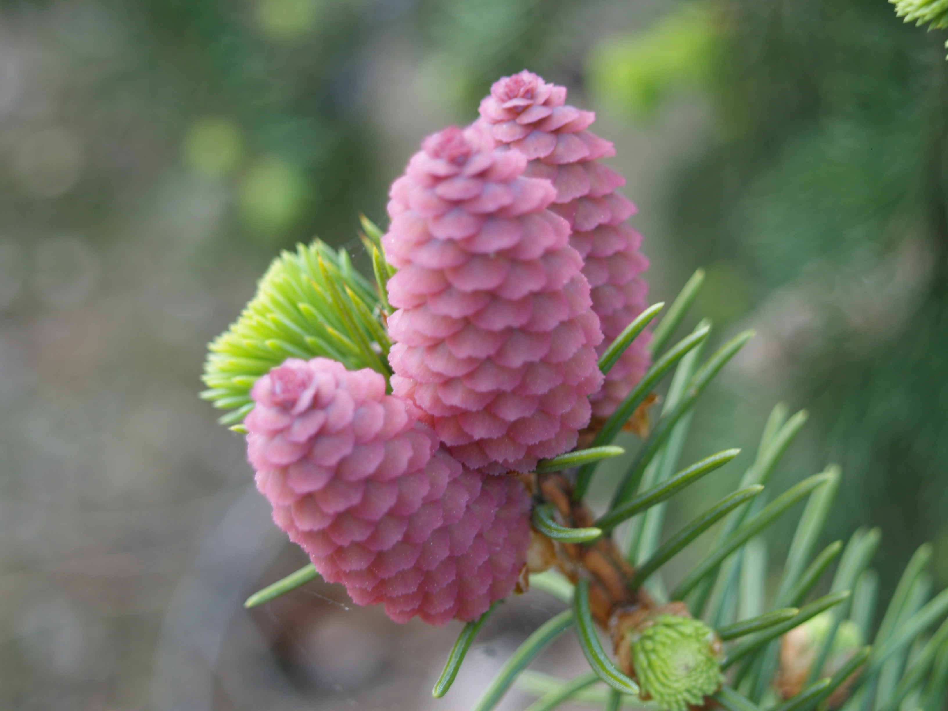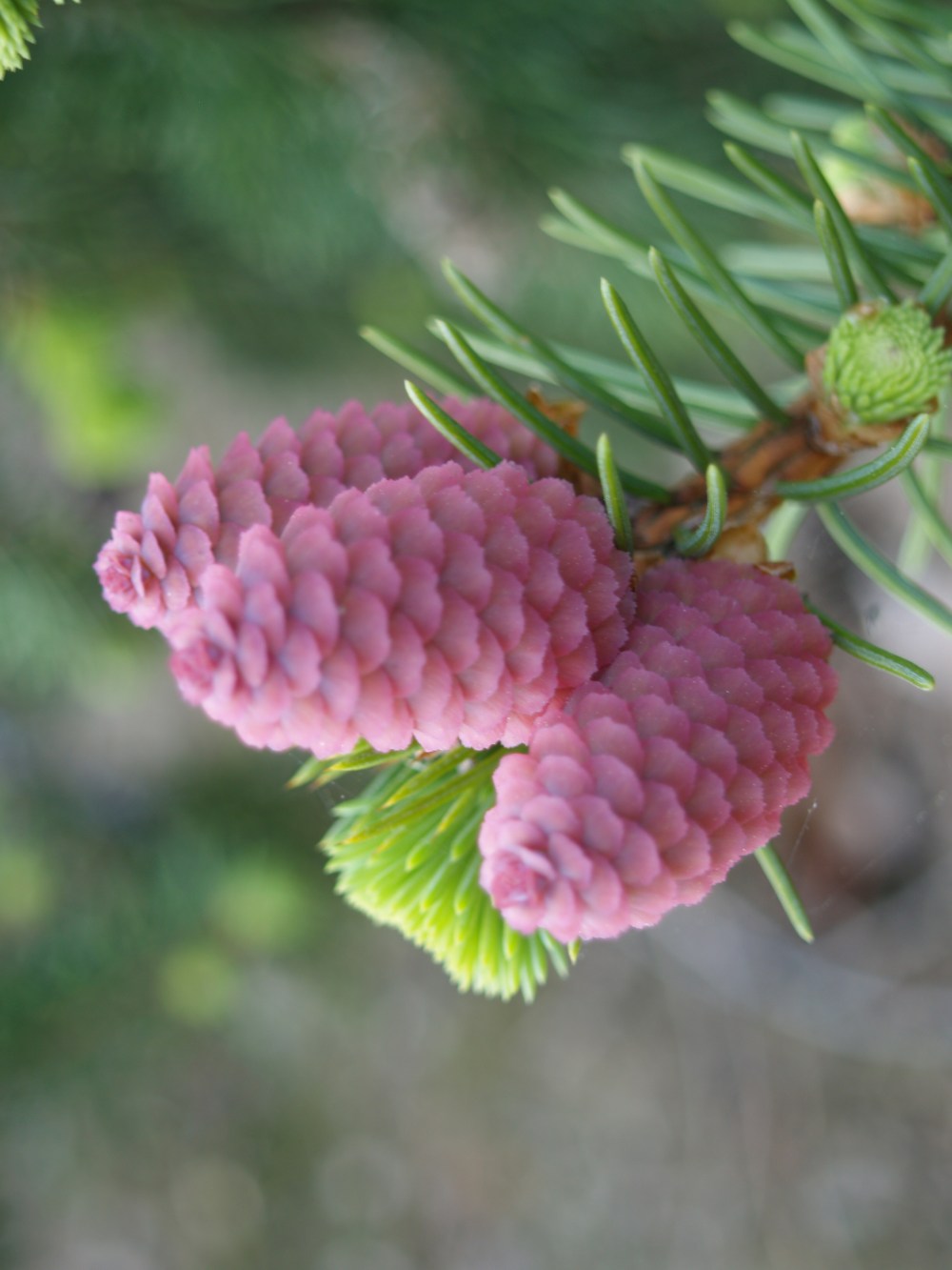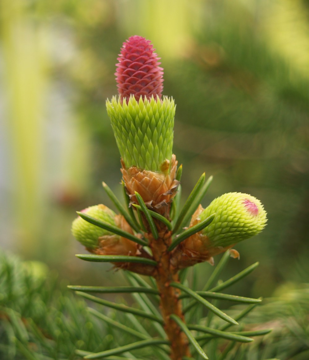 I am seduced by flowers like everyone else, but when I wander about the garden I am just as pleased to see an interesting bud, or an emerging leaf. There are two Acrocona spruce (Picea abies ‘Acrocona’, above) in the garden, and through much of the year these are awkwardly branched, not weeping, but not distinctly upright. Most people would not give a second glance to this ungainly selection of Norway spruce. But, in late April raspberry red cones begin to form at the branch tips, so that the spruce appears to be in bloom from a distance (below).