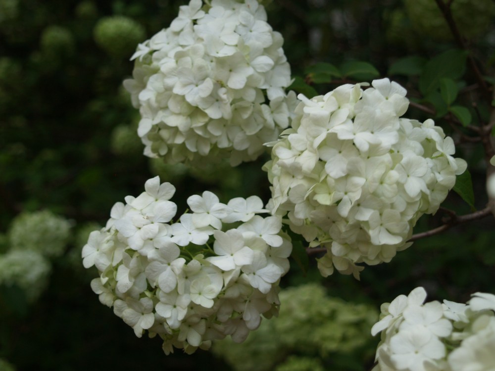 The Chinese Snowball viburnum (Viburnum macrocephalum ‘Sterile’, below) is just beginning to flower on the shaded south side of the house, and the blooms are not diminished at all by the lack of sunlight. The large, hydrangea-like flowers begin a light green, and as the flower head expands the color lightens to cream, and then to white. The snowball viburnum grows taller than ten feet, and nearly as wide, with a loose habit that is too coarse to be a centerpiece, but they are valuable when planted to the side or back of the garden.