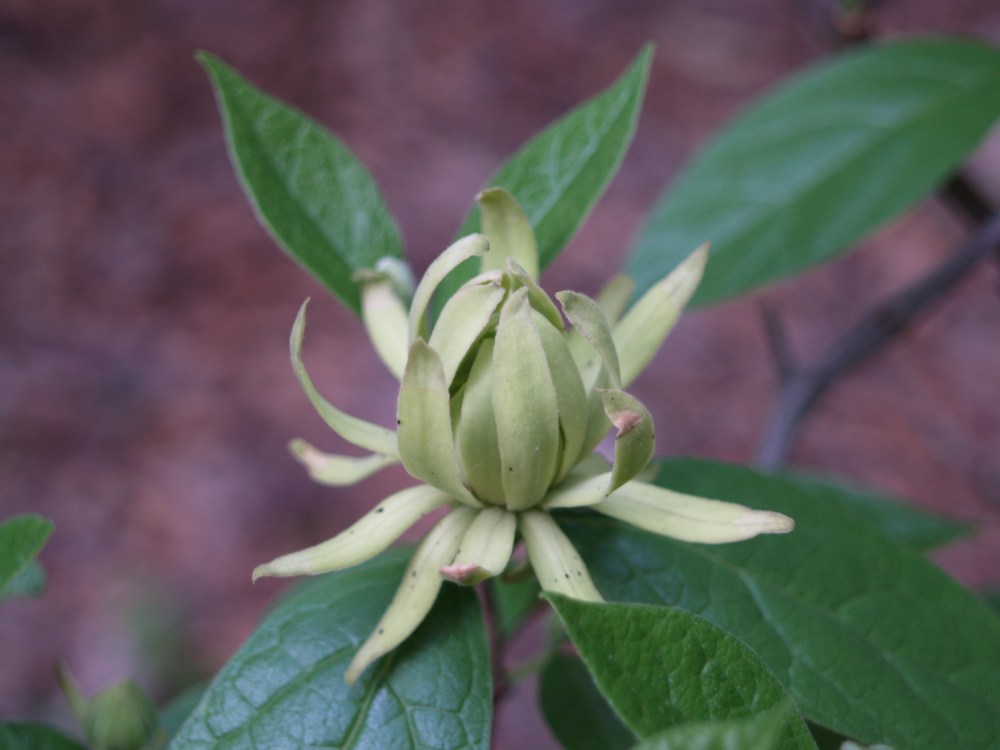 Only a few feet from the buckeye are three native, red flowering sweetshrubs (Calycanthus floridus, above), and a few paces further a yellow flowered selection (C. floridus ‘Athens’, below). I am rarely able to smell even the strongest of scented plants, but on recent evenings the sweetshrubs were quite pleasant. The blooms are an unusual red-brown, and I’m certain they will never gain more popular acceptance except to native plant lovers.