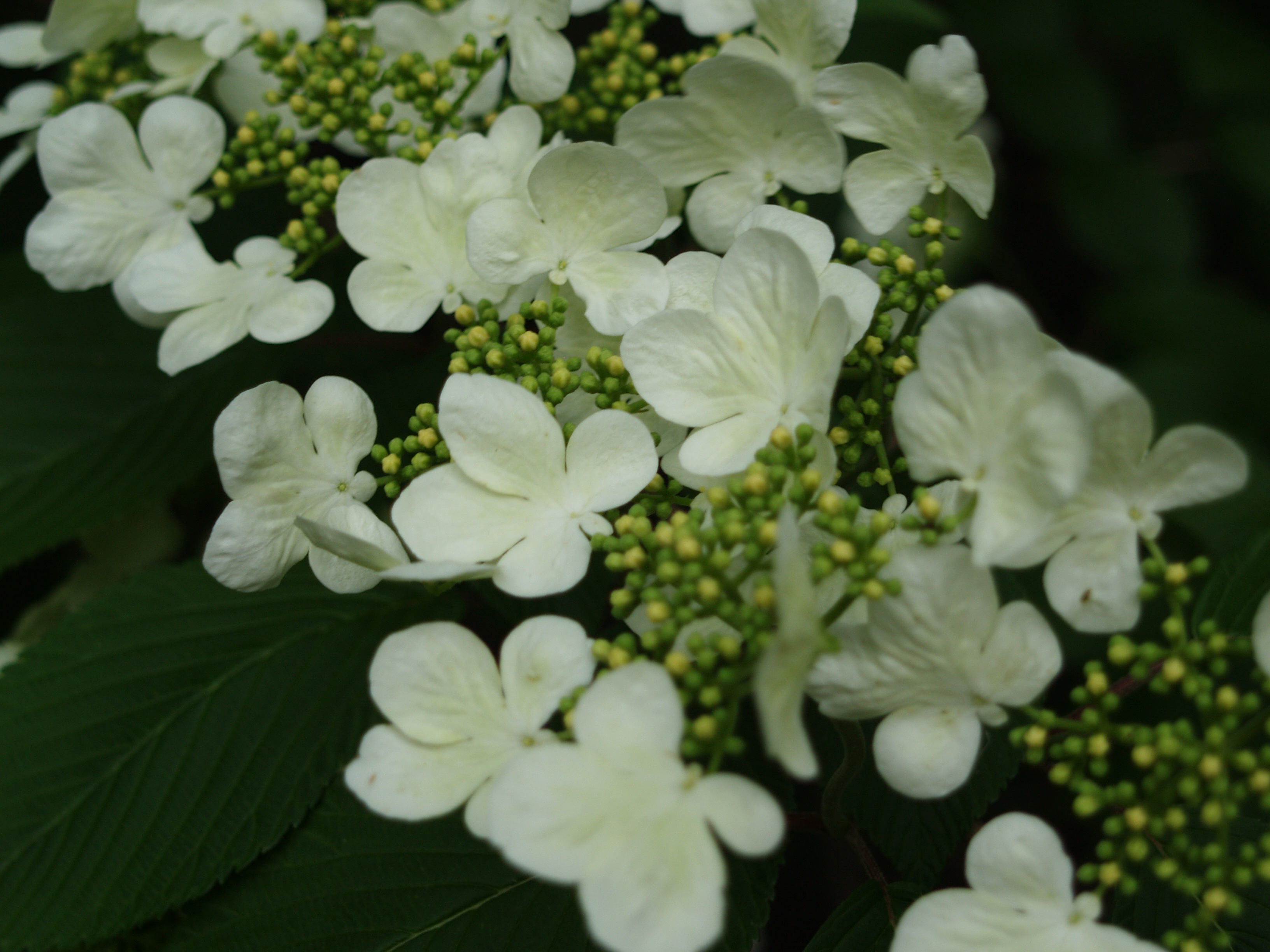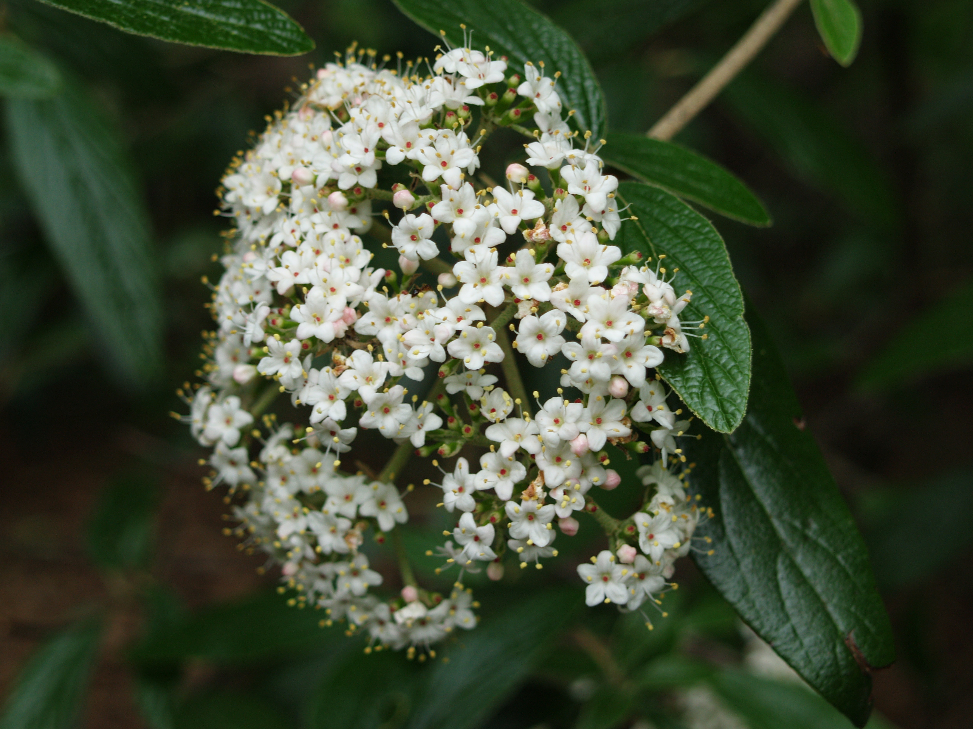 The fragrant blooms of Koreanspice and Burkwood viburnums have passed, but now the non-fragrant but splendid Maresi doublefile (Viburnum plicatum var. tomentosum, above) and Pragense viburnums (Viburnum x pragense, below) are in bloom. In the garden both have been shaded a tad more than is to their liking as the forest’s edge has spread through the years, but they continue to flower.