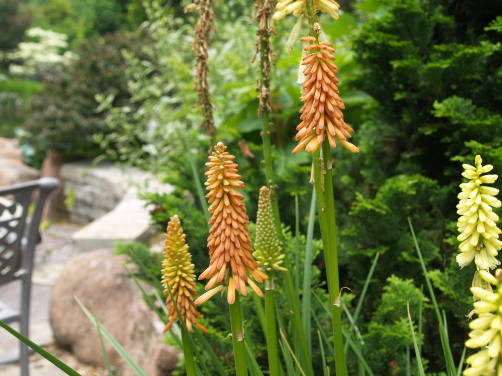 The more established perennials are not noticeably bothered by the early heat, so they go about their business. Predictably, one of the Red Hot Pokers (Kniphofia, above) planted in full sun bloomed a week ago, while another, which is probably the same cultivar (but might not be) is in a shaded spot and is just beginning to bloom. Years ago, a planting of Red Hot Pokers failed when a neighboring evergreen encroached on the clump, but this time I’ve learned my lesson and given them a few more inches.