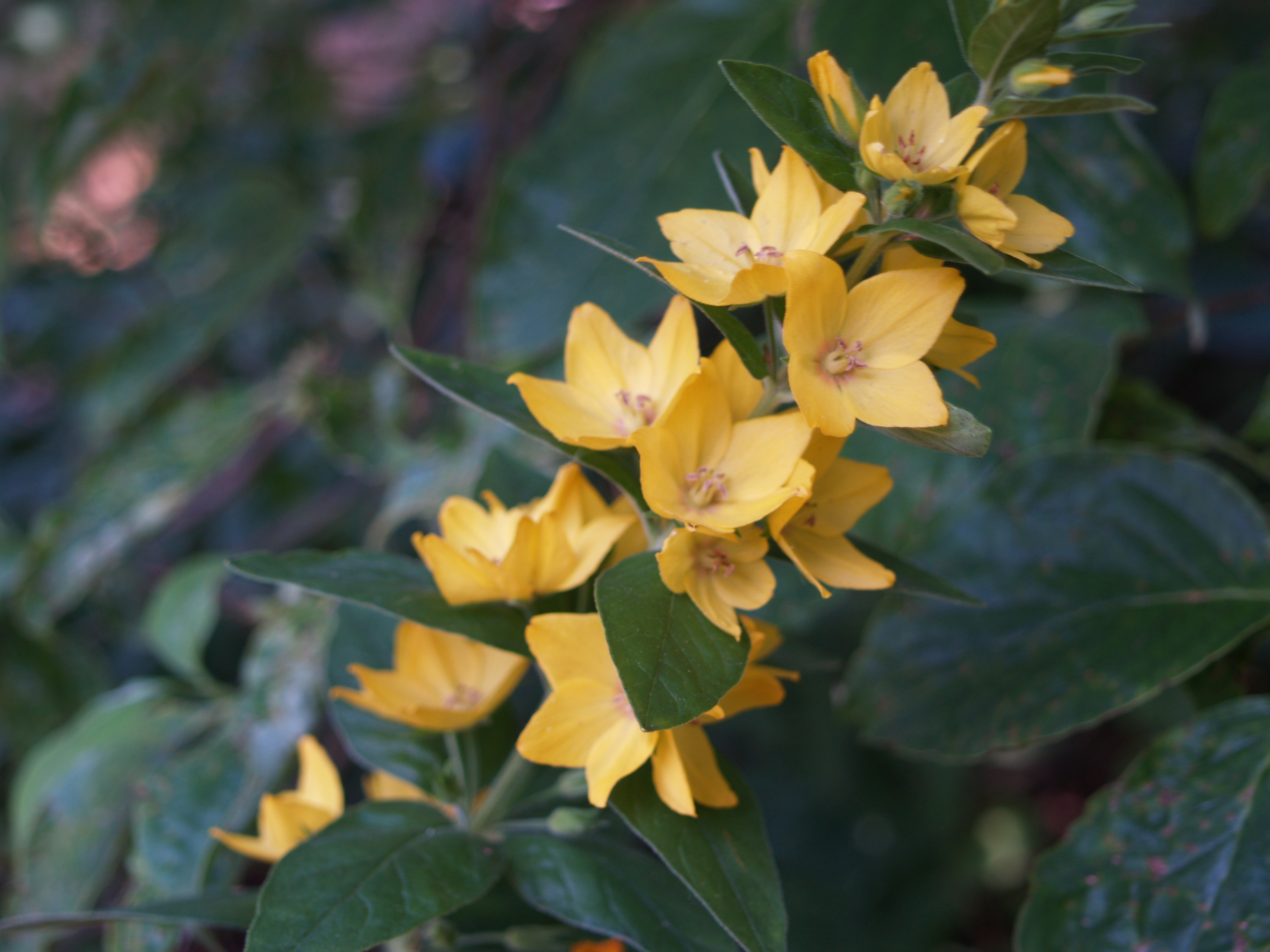 Years ago a variegated lysimachia (above) was planted in the dry shade beneath a native dogwood and in front of a free standing stone wall in the front garden, though it has been a few years since the variegation reverted and now the clump is entirely green. The clump has spread a few feet in each direction, and now it threatens to overtake a yelllow striped yucca in its path. The lysimachia has upright stalks that flop about so that the clump has an unmannerly appearance, and I have considered digging it up for years. But, there it sits, and today the blooms are quite nice.