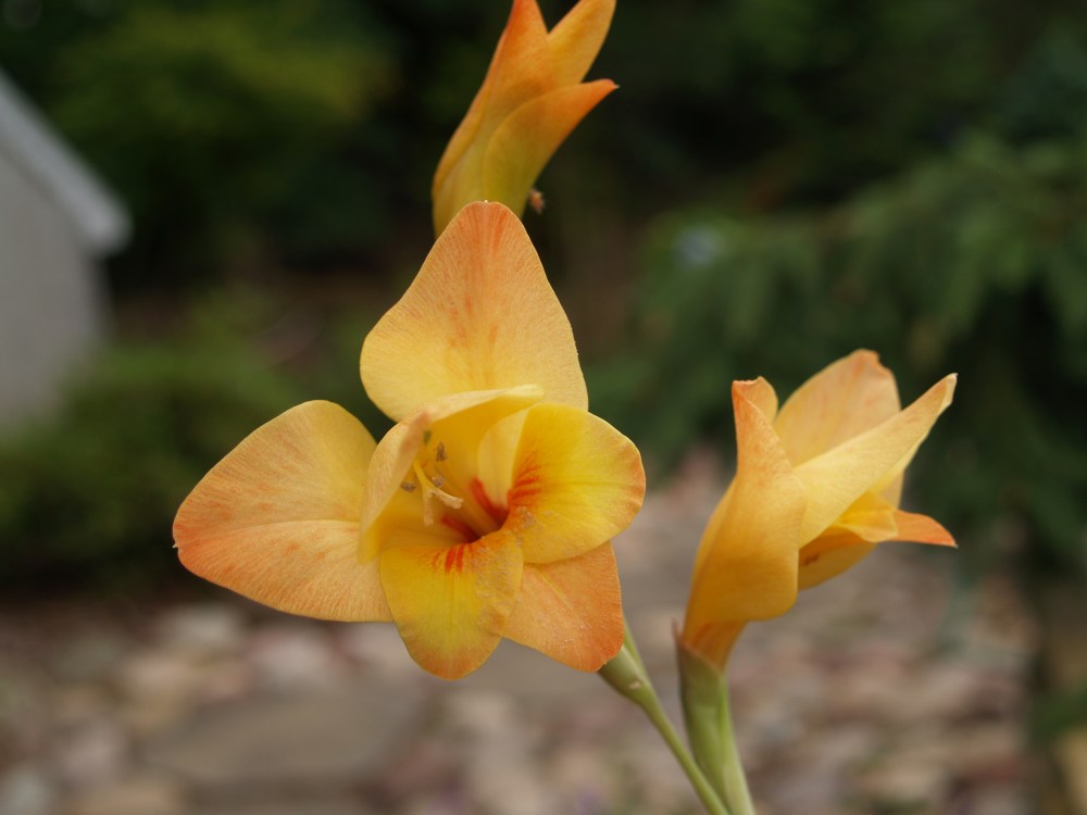 Gladiolus dalenii ‘Boone’ (above) was planted only a few inches from a dry stacked stone wall that retains the lower edge of the swimming pond so that the tall flowering stalks will lean against the wall rather than flopping about. One stalk was flat on the ground this morning, while the other leaned against the wall as intended. Oh well, I figured there was only a fifty percent chance that the scheme would be successful.