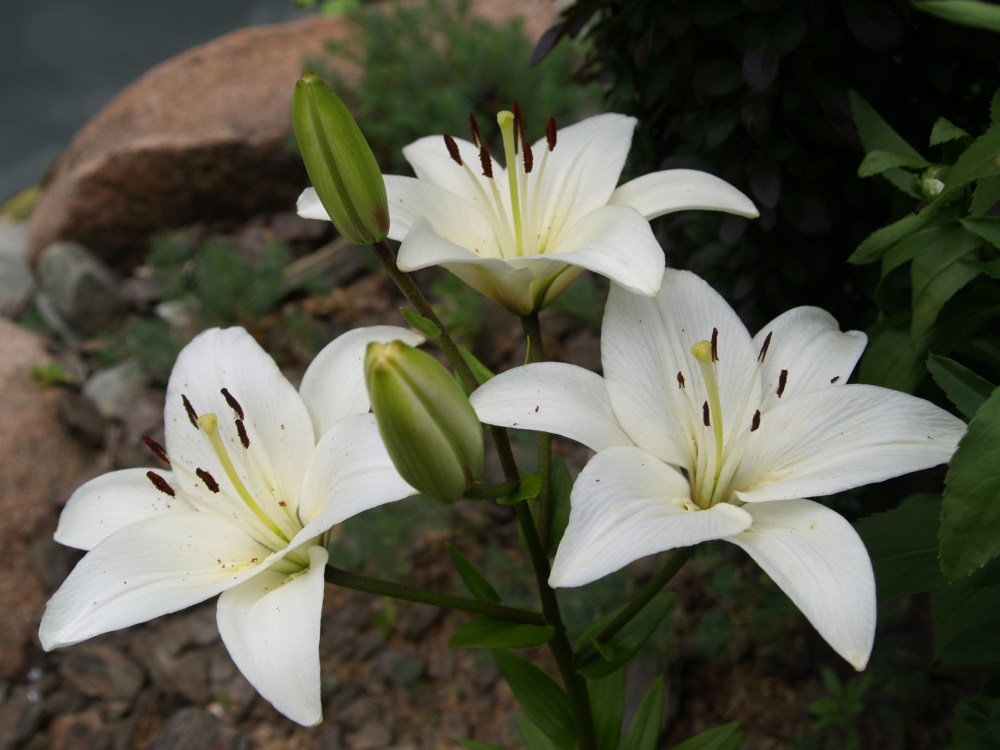 The first of the Asiatic lilies (above) is blooming, and I have no idea what the variety is, but there are a handful in various colors so that there are flowers into early July. Though the stalks grow straight, these are not so tall that they flop about, even when the soil is dry and the wind blows. Each stalk carries three or more blooms, and several of the same color are planted close through a low growing euphorbia so that there is a nice mass of white, yellow or orange, and I don’t recall but probably a red that flowers at the tail end.