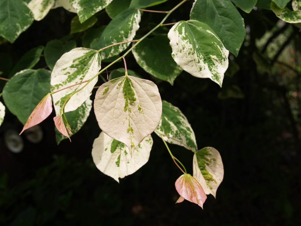 The native redbud (Cercis canadensis) has leathery green leaves that hold up well in extreme heat, but the red leafed ‘Forest Pansy’ and variegated ‘Silver Cloud’ (above) stand out in the summer garden. ‘Forest Pansy’ will begin to fade and wimp out late in July, but ‘Silver Cloud’ comes into its glory in June. Its emerging spring foliage is mostly green, with perhaps an edge of pink or cream, and through the spring you would not think there is anything exceptional about this tree. Today, from across the garden you are convinced of its merit. The pink and cream coloration fades only slightly late into the summer, and there is no other tree in the summer garden that is so splendid for so long a period.