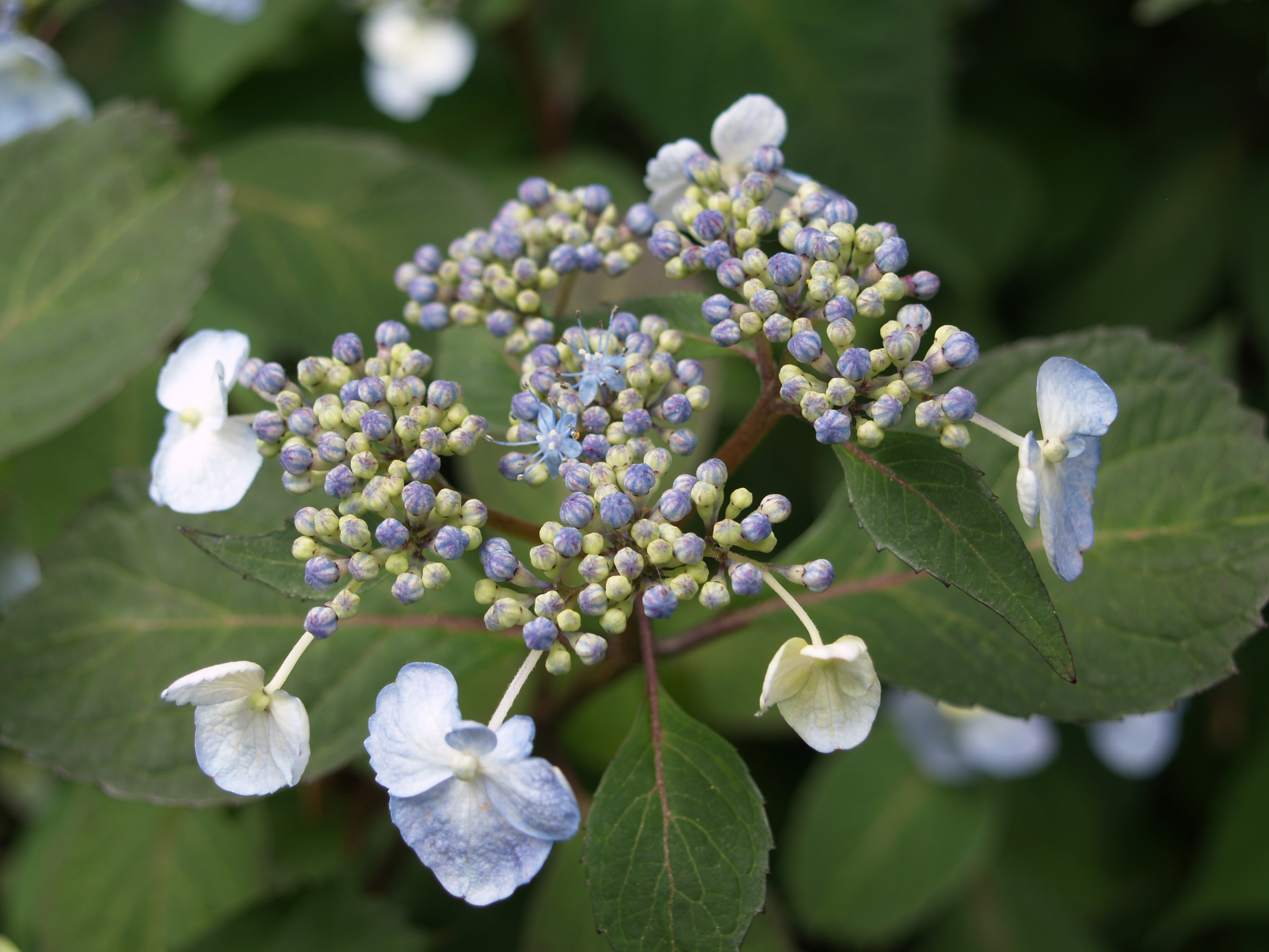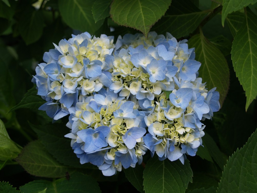 To wrap up our day we’ll conclude with the latest of the hydrangeas to burst into bloom. The broad, cone-like flowers of Oakleaf hydrangeas (Hydrangea quercifolia, above) open slowly beginning in late May and persist  through June, sometimes into July. The flowers are effective even as they fade to a light tan, and the large, oak-shaped leaves are highly regarded, even if their brilliant red autumn color is not considered. There are low growing and medium sized cultivars available, but I have planted a handful of the tall growing native, and there is not another shrub in the garden treasured more. Alongside the oakleaf and mophead hydrangeas I have planted several lacecap varieties, and though I was slow to warm to ‘Lady in Red’ (Hydrangea macrophylla ‘Lady in Red’, below) it now blooms heavily and dependably, and I am happy not to have tossed it out when I was tempted by its meager flowering the first few years after it was planted. I am not highly regarded for my patience, but occasionally laziness is shown to be a virtue when a disappointing plant is given a second and third opportunity.
