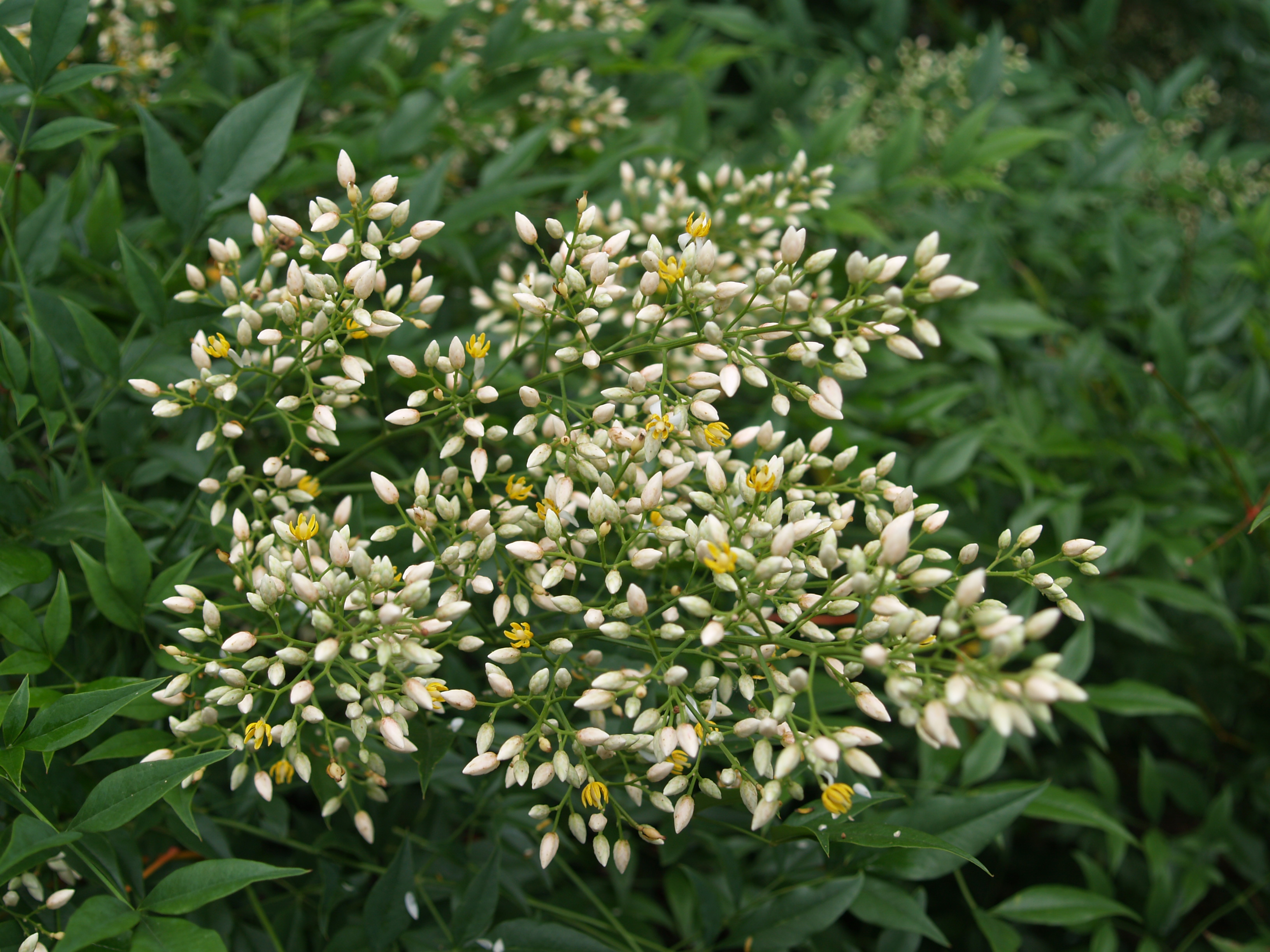 I have planted small clumps of tall nandinas (Nandina domestica, above) throughout the garden. Many gardeners prefer the compact varieties that don’t grow as leggy, but without lower branches the nandinas give the feel of a six foot tall bamboo, and of course one that spreads very slowly. In sun or shade nandinas grow lush foliage, and the clusters of small white blooms are often overlooked. The berries that follow in late summer are often so heavy that sturdy branches lean under their weight, and here is a bothersome issue. Nandinas are considered invasive in many parts of the country, but birds eat the berries reluctantly (I see little sign that they are ever eaten), so the only seeds that germinate are those that drop and roll a few feet from the parent plant. I have yet to see evidence in my garden or elsewhere that this plant is a threat to native species.