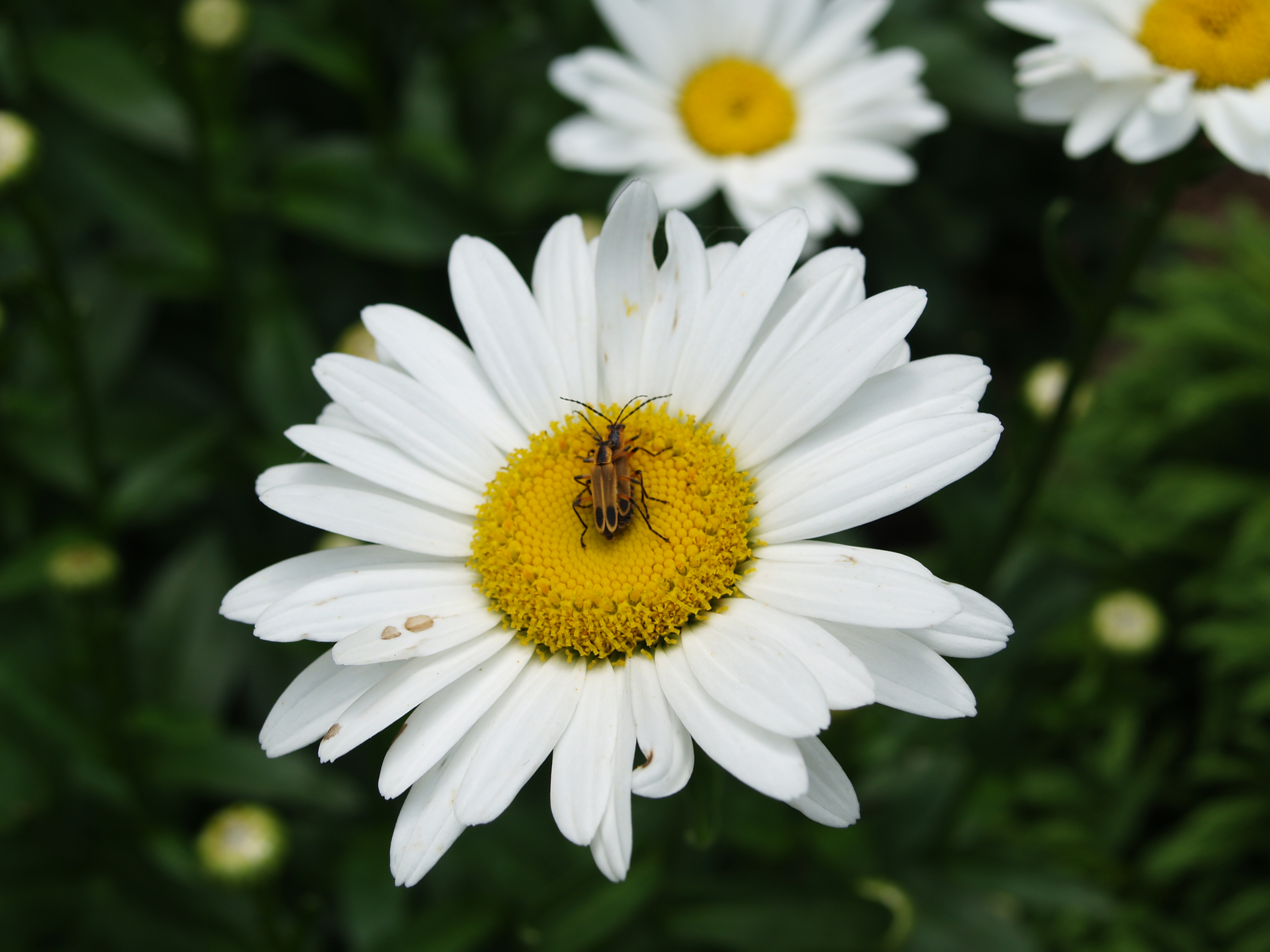 The Shasta daisies (Leucanthemum x superbum ‘Becky’, above) have grown taller than usual this year, I suppose a consequence of the regular spring rainfall. The stems remain stiffly upright (though angled toward the evening sun), and they sway in unison to the rhythm of the breeze.