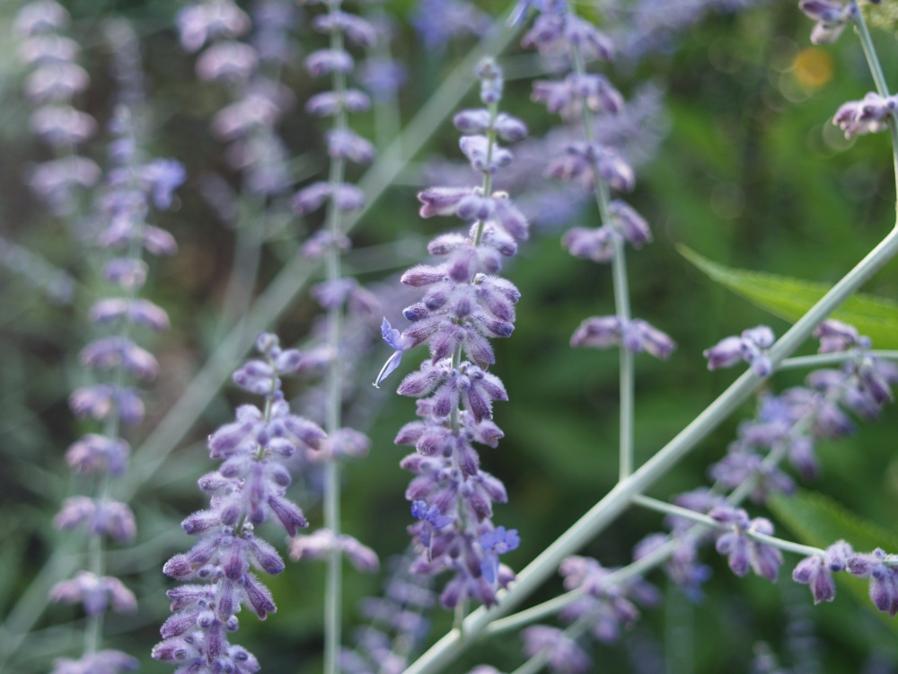 With silver gray foliage and lavender blooms Russian sage (Perovskia atriplicifolia, above) looks to be drought tolerant, and in fact it seems happy in the harshest, driest soils so long as it receives adequate sunlight. I’ve found that it works well to fill gaps between shrubs that prevent it from flopping about.
