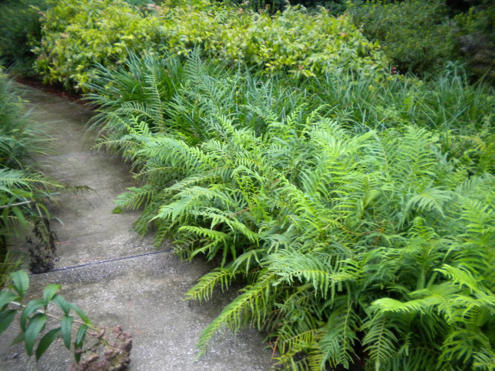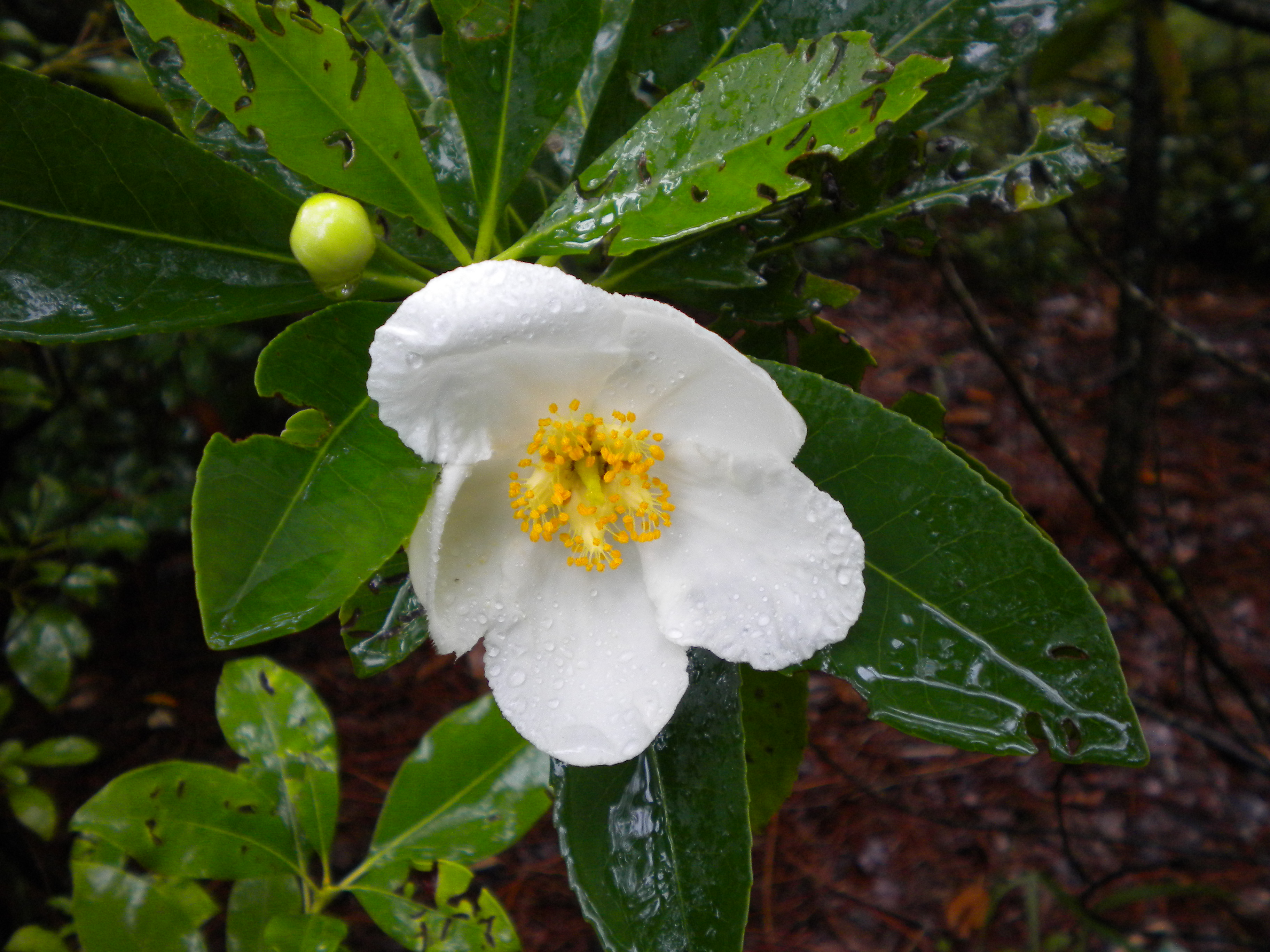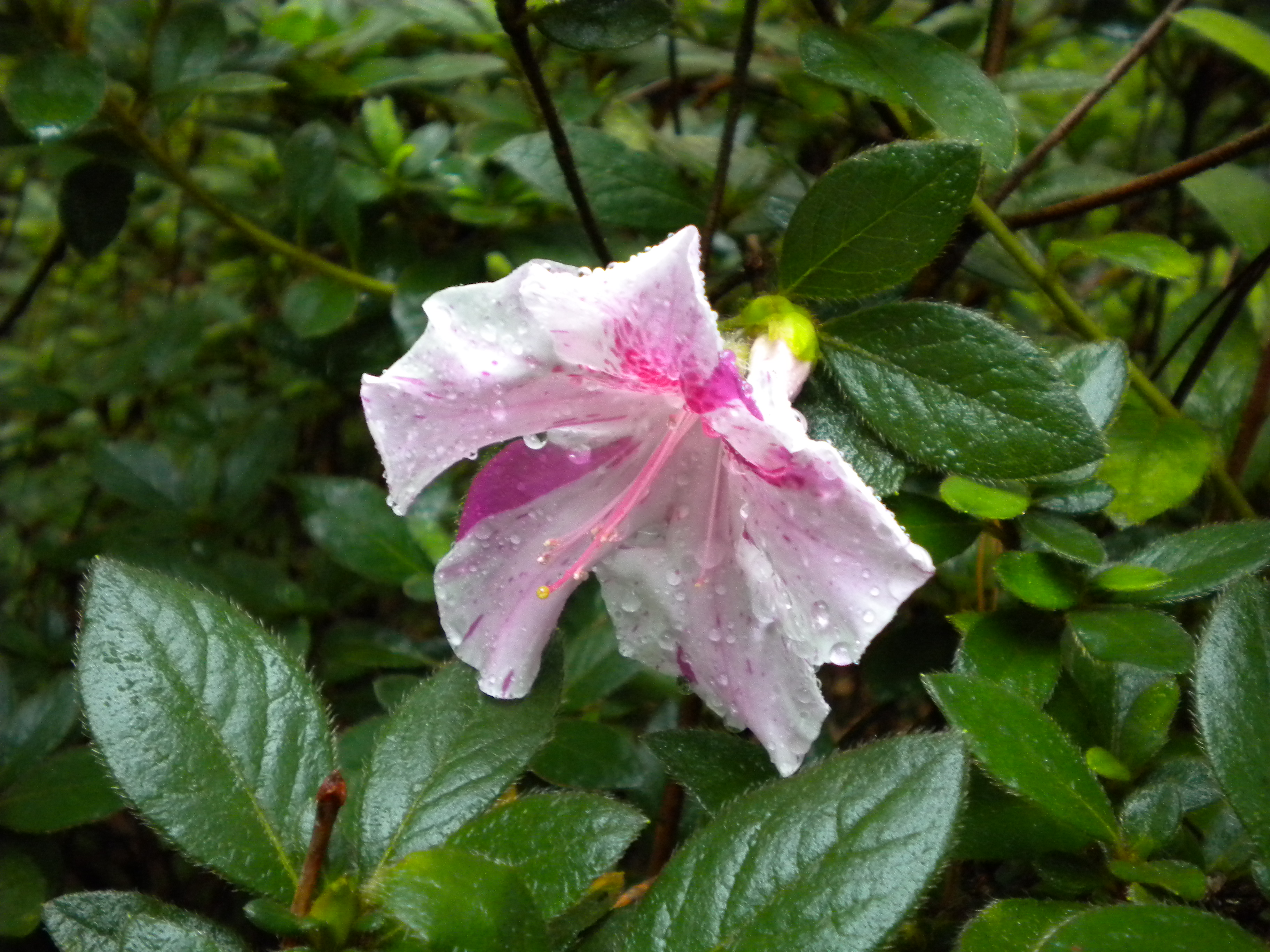The Garden’s azalea collection includes Southern Indica varieties, but also Robin Hill, Kurume, and Encore azaleas that are found in many mid-Atlantic gardens. In July there is no reason to expect to see blooming azaleas, but the Encores displayed a few scattered flowers (above), and ferns and camellias glistened in the dampness.