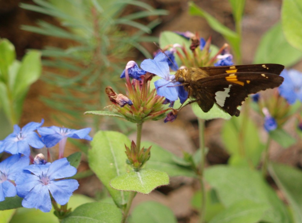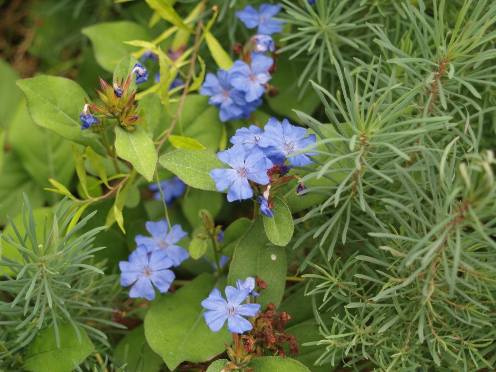 Instead, the plumbago has managed to weave itself into small openings so that it now appears more vigorous than before the spurge invaded. The first blue flowers appeared early in July, and these will persist into early autumn when the foliage turns to a deep red in full sun. In this half shaded location the leaf color will be more mottled, but still delightful.