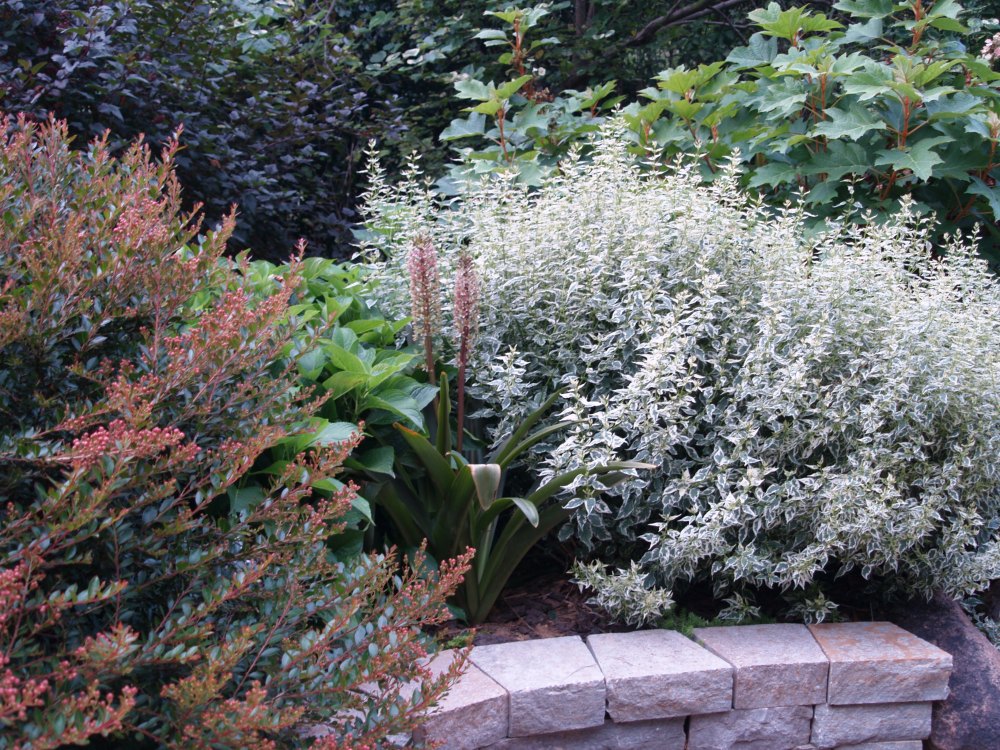 When the large swimming pond was constructed in the rear garden an adjacent stone patio and fire pit were added, and a low wall of cut stones and granite boulders was built to retain the gradual slope. A curved, cut limestone seating wall mirrored the curve of the circular fire pit, and above this were planted dwarf crapemyrtle (Lagerstroemia ‘Cherry Dazzle’), hydrangeas (H. macrophylla and H. quercifolia), and a variegated caryopteris (C. divaricata ‘Snow Fairy’, above). Only a few years later the shrubs have grown so that there is no space for sitting, but a small opening between shrubs afforded the opportunity to plant a burgundy leafed pineapple lily (Eucomis comosa ‘Sparkling Burgundy’, below).