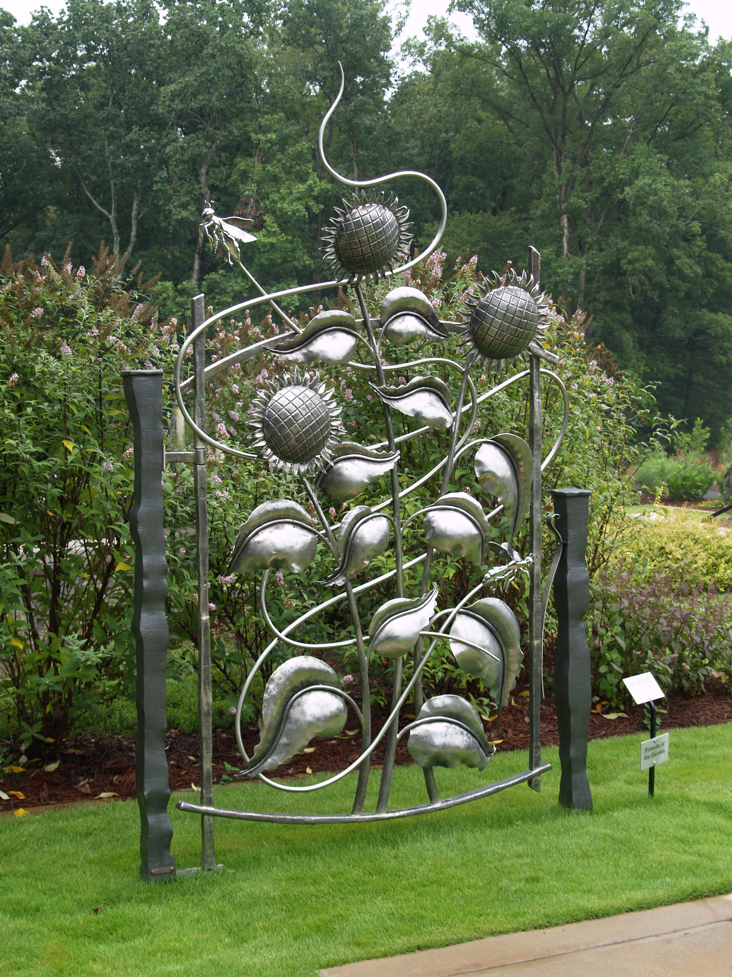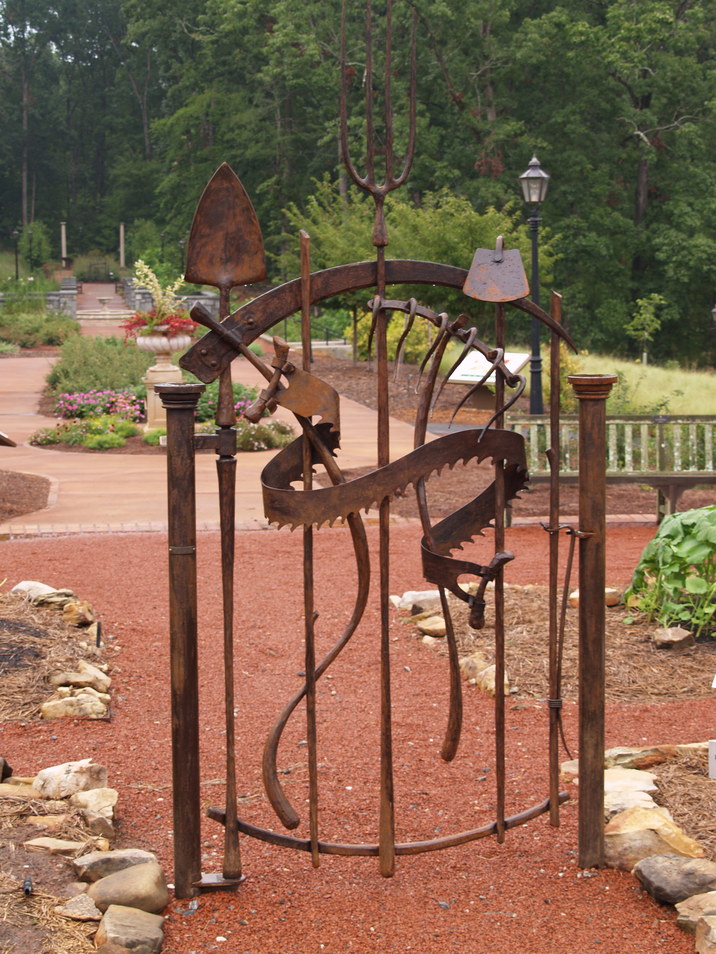 On display in the Botanical Garden since March are marvelous gates (above and below) sculpted by Andrew T. Crawford Ironworks. They’re a bit large for most gardens, and though my wife was enthralled and had to have one, her enthusiasm cooled slightly when she heard the selling price for these beauties.