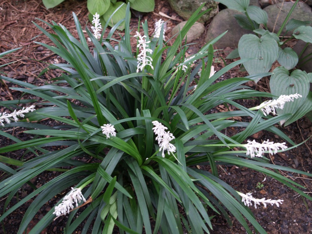 A year ago I planted a new mondo grass, “Crystal Falls’ (Ophiopogon jaburon ‘Crystal Falls’, above) with long arching, dark foliage and extended panicles of white blooms in mid summer. It appears to be a jumbo sized green leafed liriope, but with more prominent blooms, and like all the liriopes in my garden it needed a trim early in the spring since the leaf tips were in tatters. All was fine until the other liriopes began to grow, then the dwarf mondos that need only a bit of tipping to prune where they’ve become shaggy. Crystal Falls was a still life, alive but frozen in its butchered glory.
