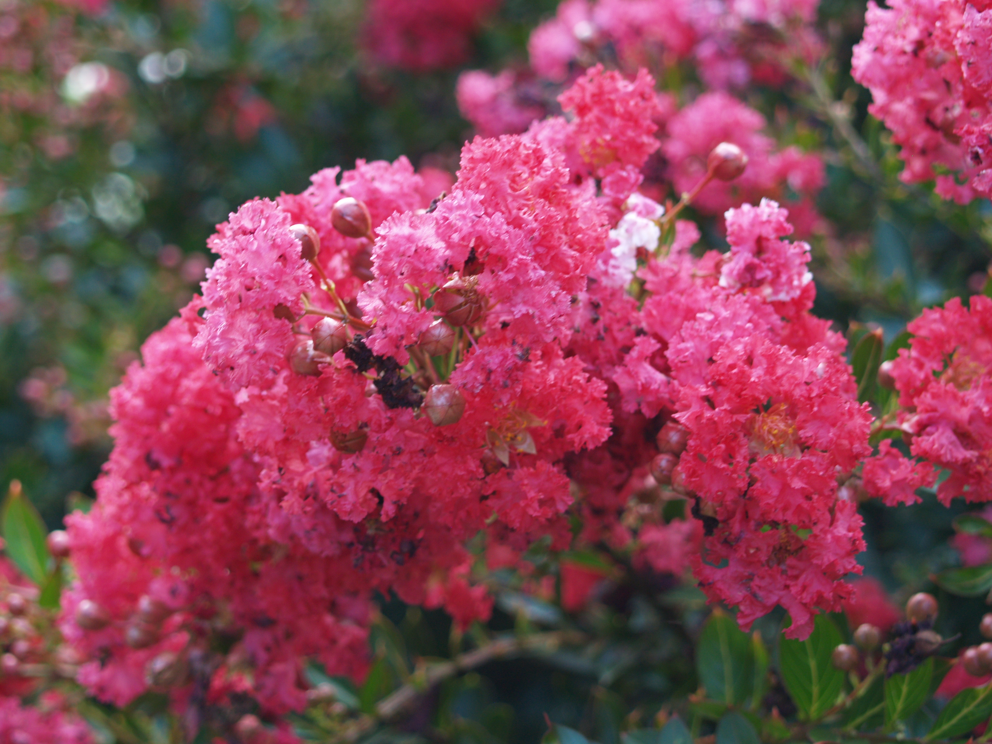 The one crapemyrtle that is growing in unchallenged sunlight is blooming exceptionally well, undeterred by either one hundred degree temperatures or weeks long drought. Still, there is a problem, but this one of the gardener’s making. The dwarf Cherry Dazzle (above) grows to only three to four feet tall, and usually I would suspect a shrub to grow roughly the same in width. Today, the crapemyrtle is in full bloom, and splendid, but at least seven feet across, overwhelming a stone seating bench, and reaching nearly into the fire pit. Of course it was planted far too close to both, and with proper planning I would have less to complain about, but there is less adventure in getting things right from the start (I tell myself).