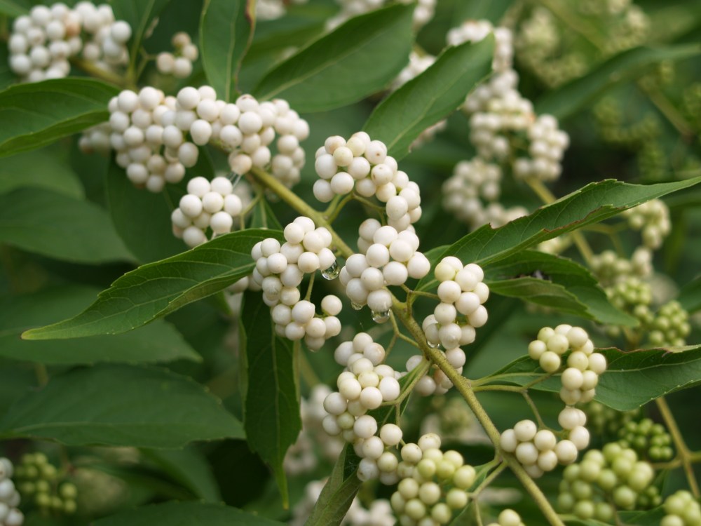 But, by mid August the flowers have turned to small green berries, and late in the month these begin to ripen to glossy purple or white. Now you have discovered why this very ordinary shrub deserves a spot in the garden.