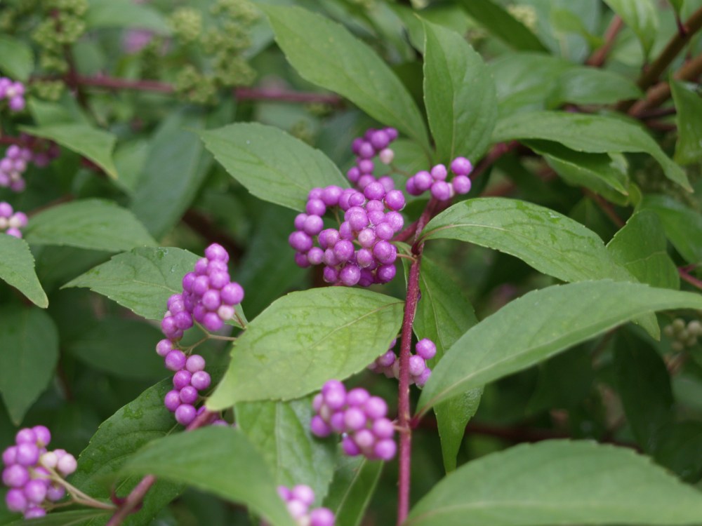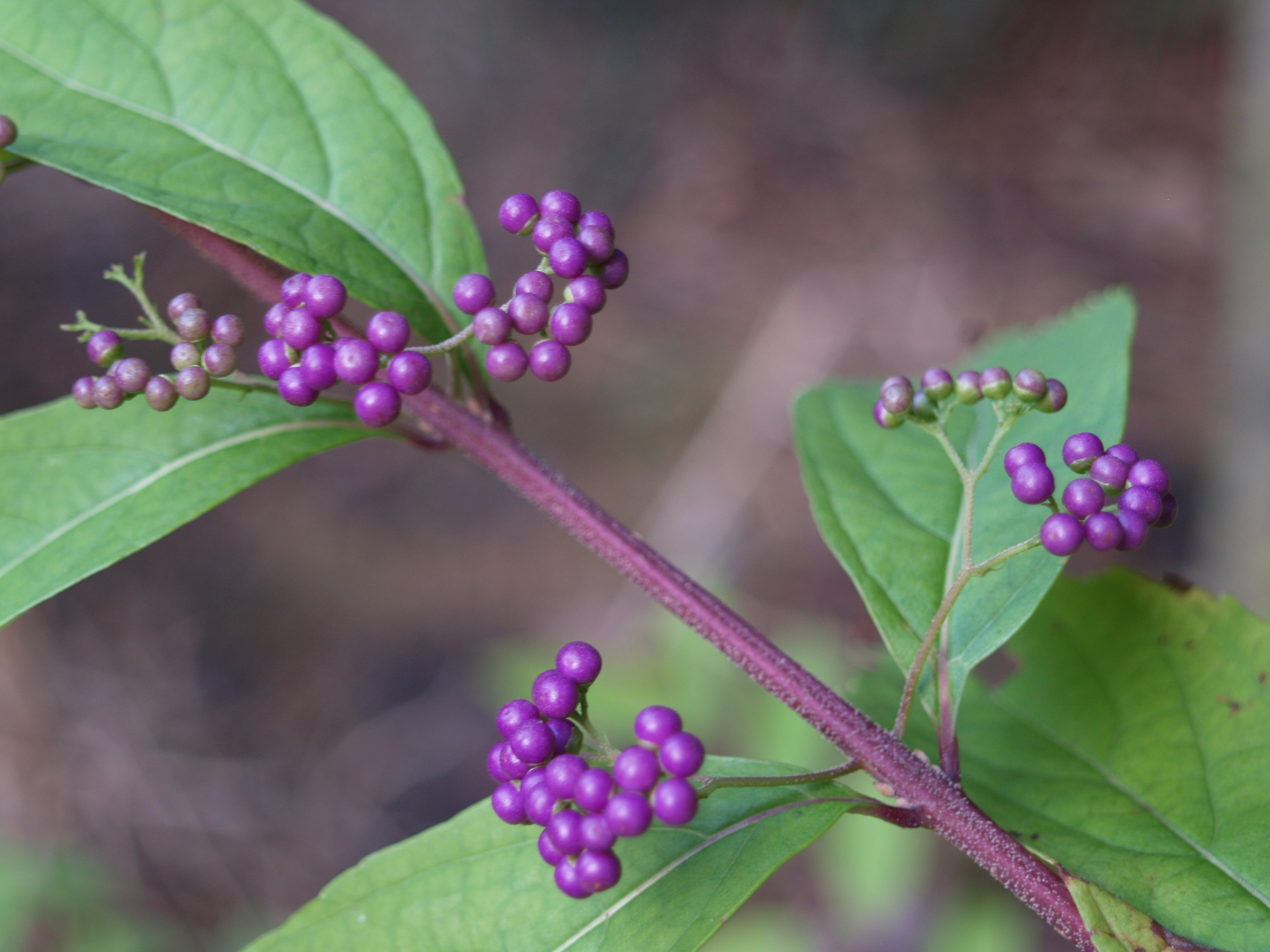 Though the American beautyberry is native from the mid Atlantic through the southeast (Callicarpa americana, above), the southeast Asian beautyberry (Callicarpa dichotoma, below) branches more densely, and is more commonly found in commerce.
