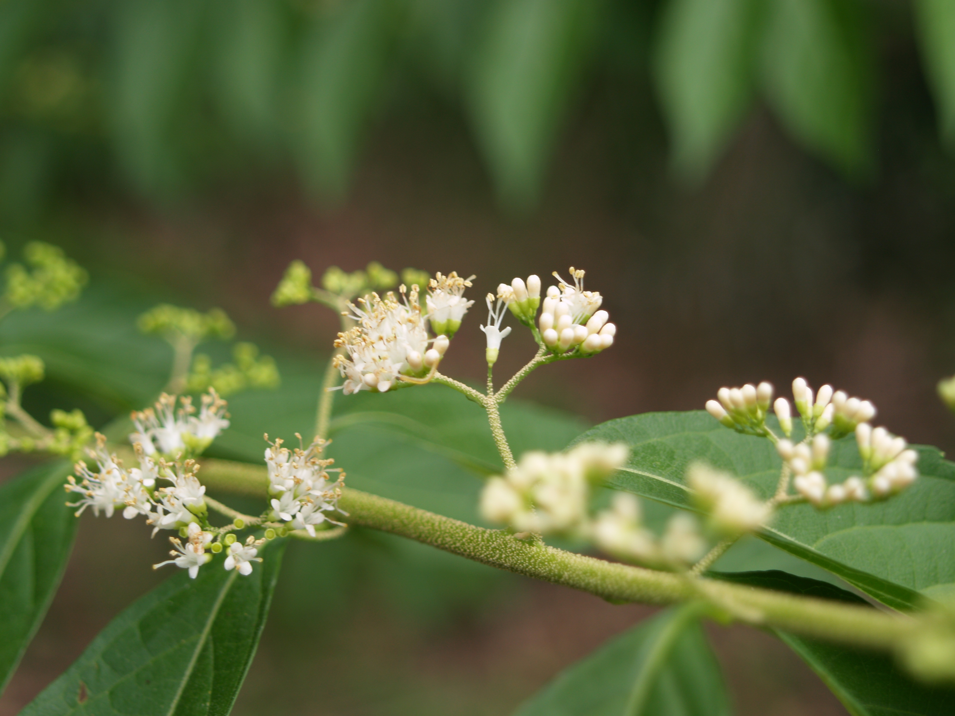 Beautyberries (Callicarpa) do not leaf until late in April, and then the foliage is unremarkable, as are the clusters of small white blooms (below) in late July that are arranged along the shrub’s arching stems. The shrub grows quite large, and its form is coarse and unsuitable for a prominent position in the garden.