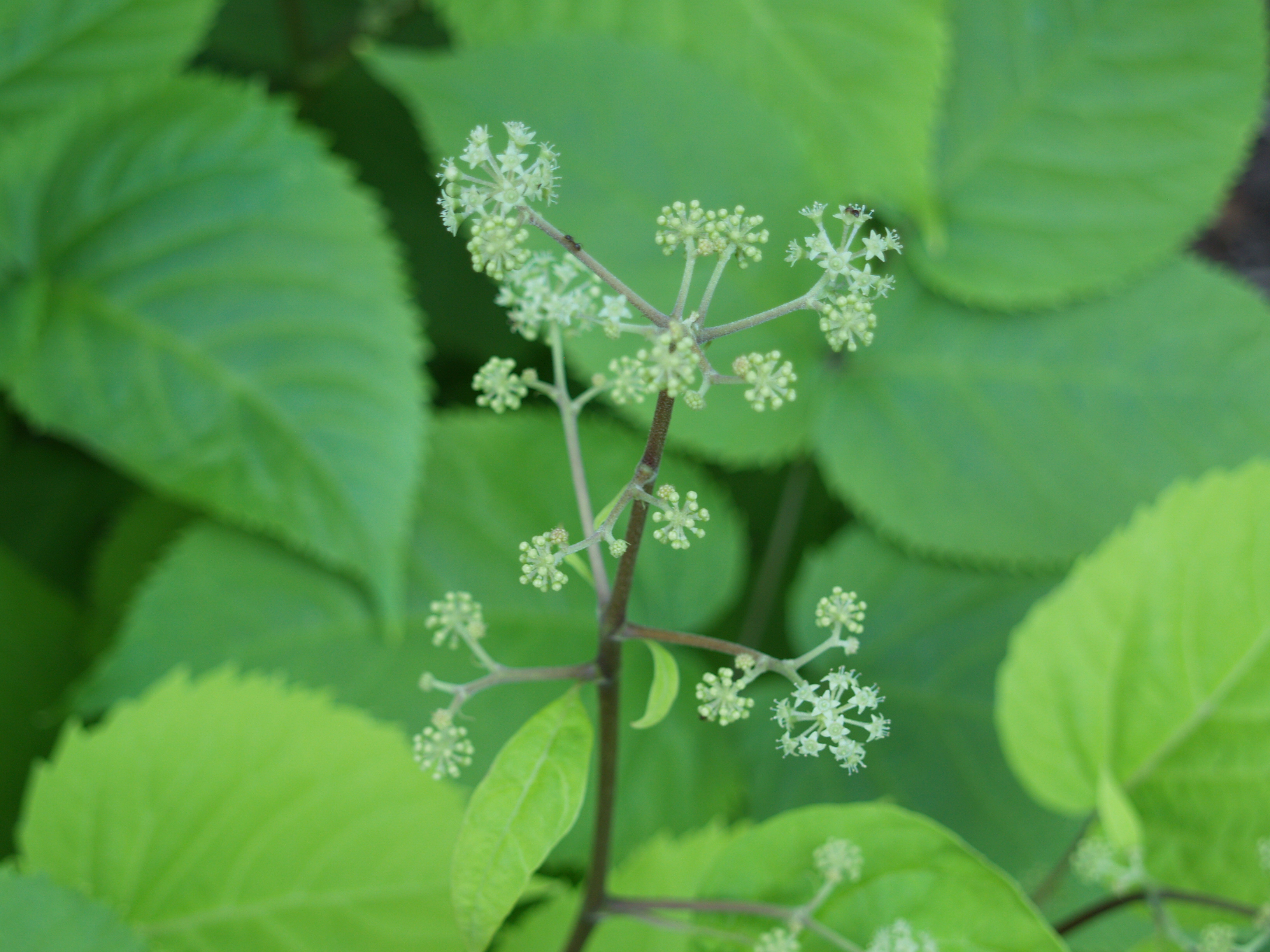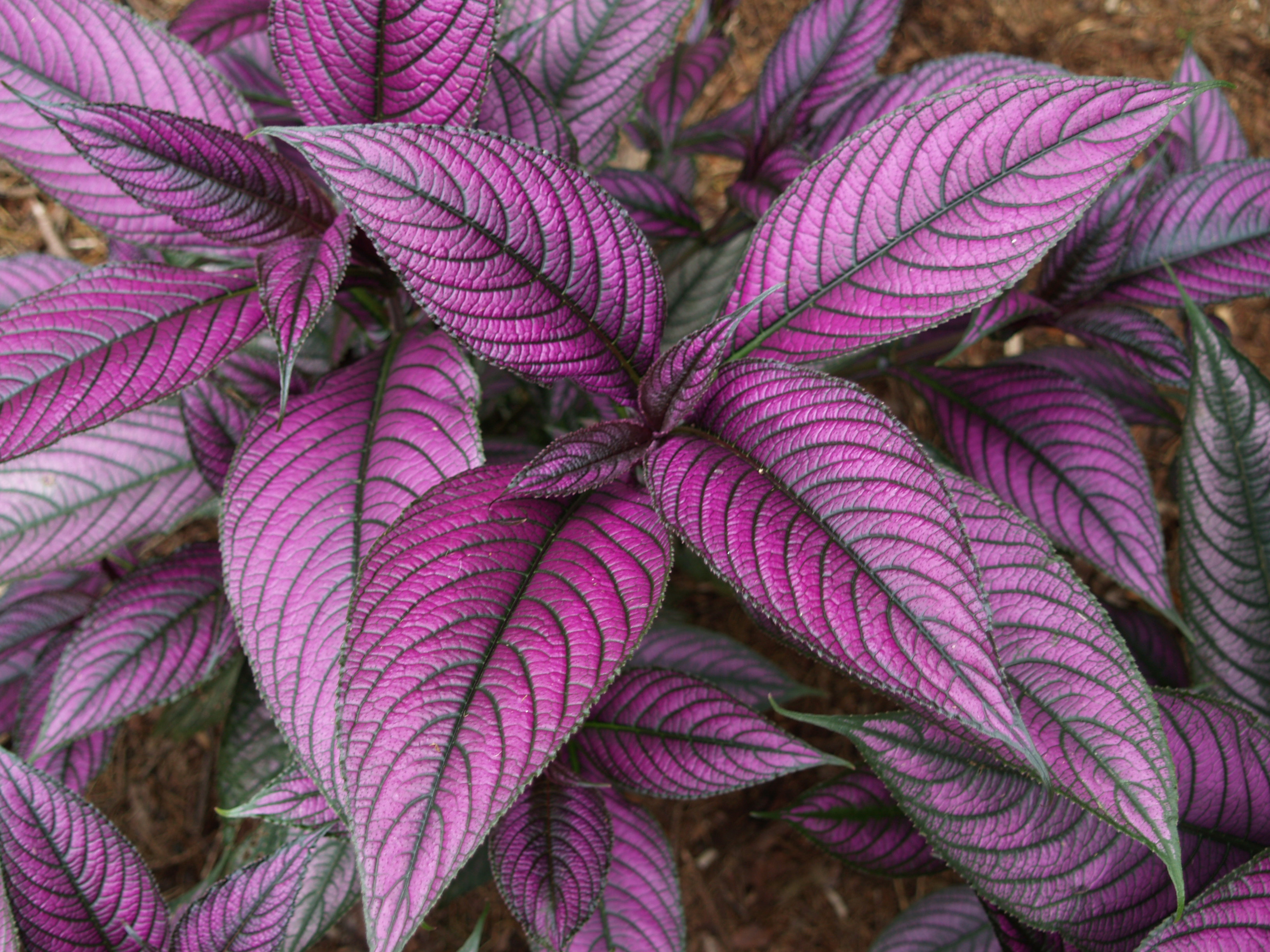 The yellow leafed aralia (Aralia cordata ‘Sun King’, above) is blooming, and as expected the flowers are unremarkable when compared to the brilliantly colored foliage. Still, the small, globular white blooms are unusual, even if they aren’t very showy. The foliage is quite splendid for a shady spot, where the bright yellow shines, and the aralia will grow to three feet (or more) tall and wide, so it works well planted to the back of the shady border. I’m certain that there are all sorts of amazing color combinations that are possible with such a bright yellow, and I’ve planted the annual, metallic purple Persian Shield (Strobilanthes dyerianus, below) in front. As color blind as I am, this will wake you up on a rainy afternoon.