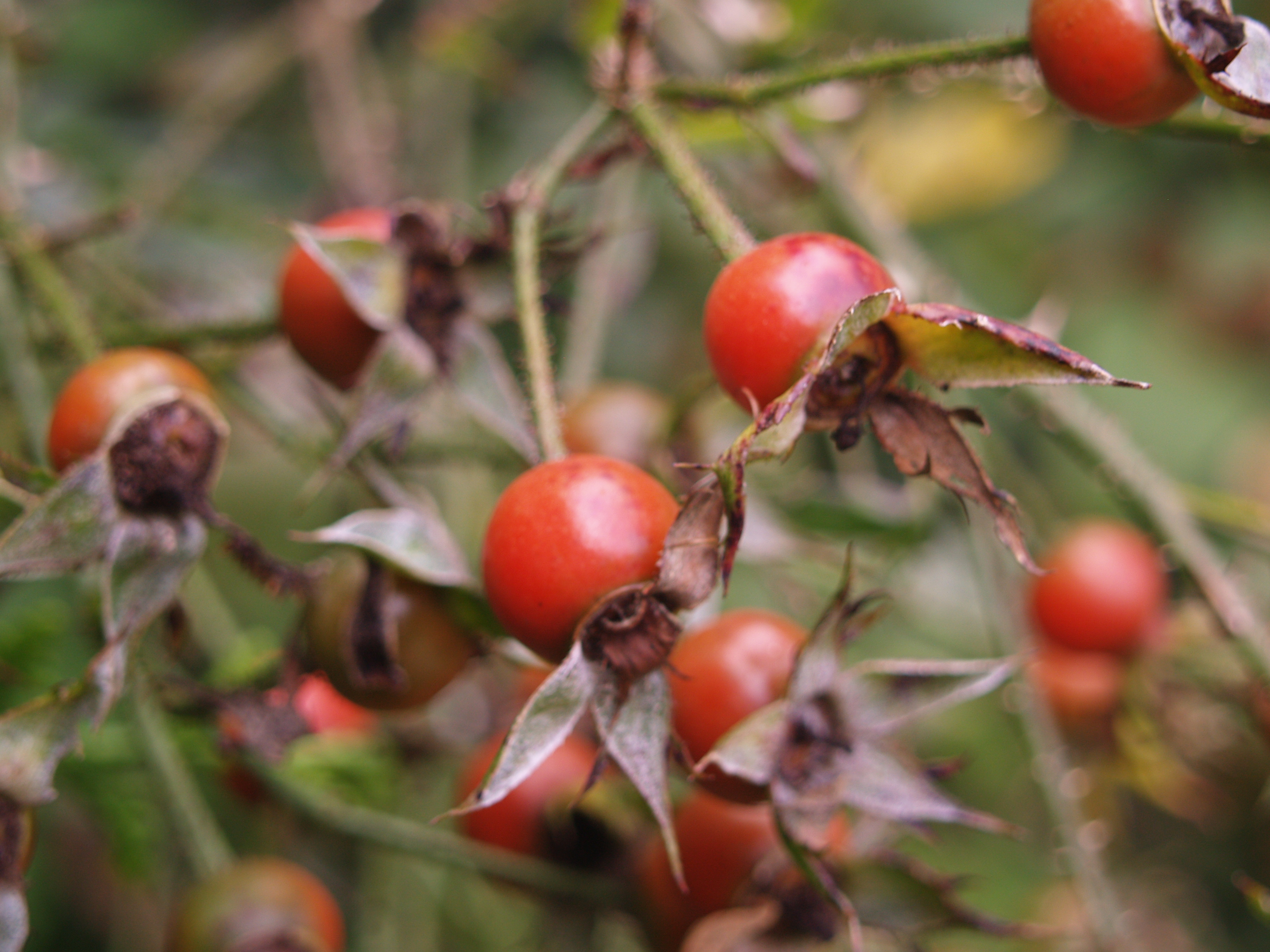 The fruits of roses are rose hips (above), and their abundance varies by variety. Many of the rose hips have ripened to red now, and few will make it through the winter and not be snatched by birds, squirrels, rabbits, and rodents.