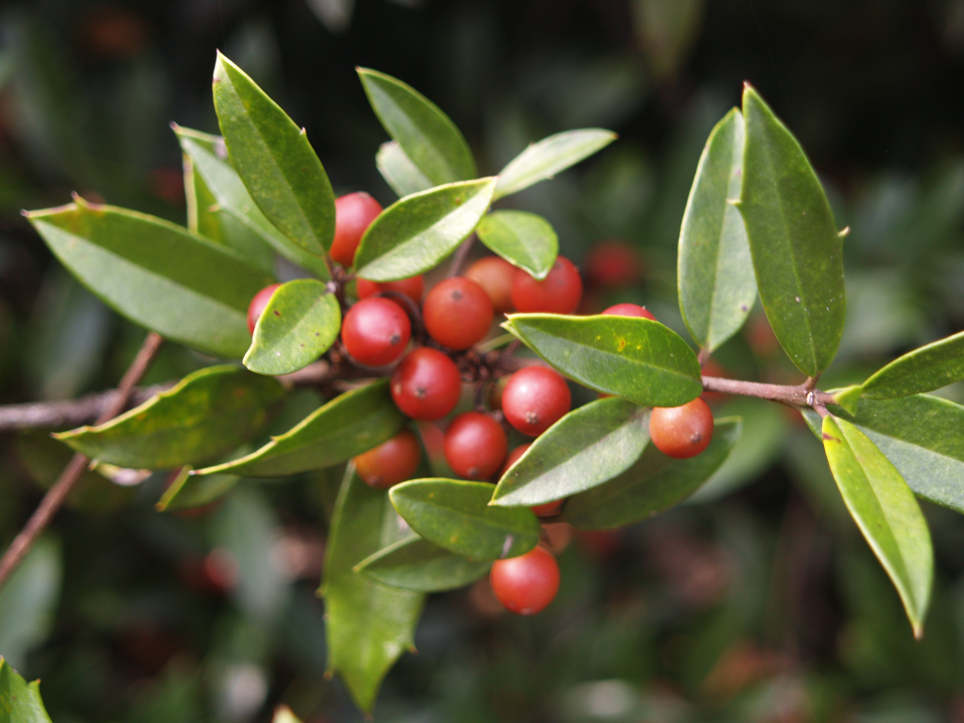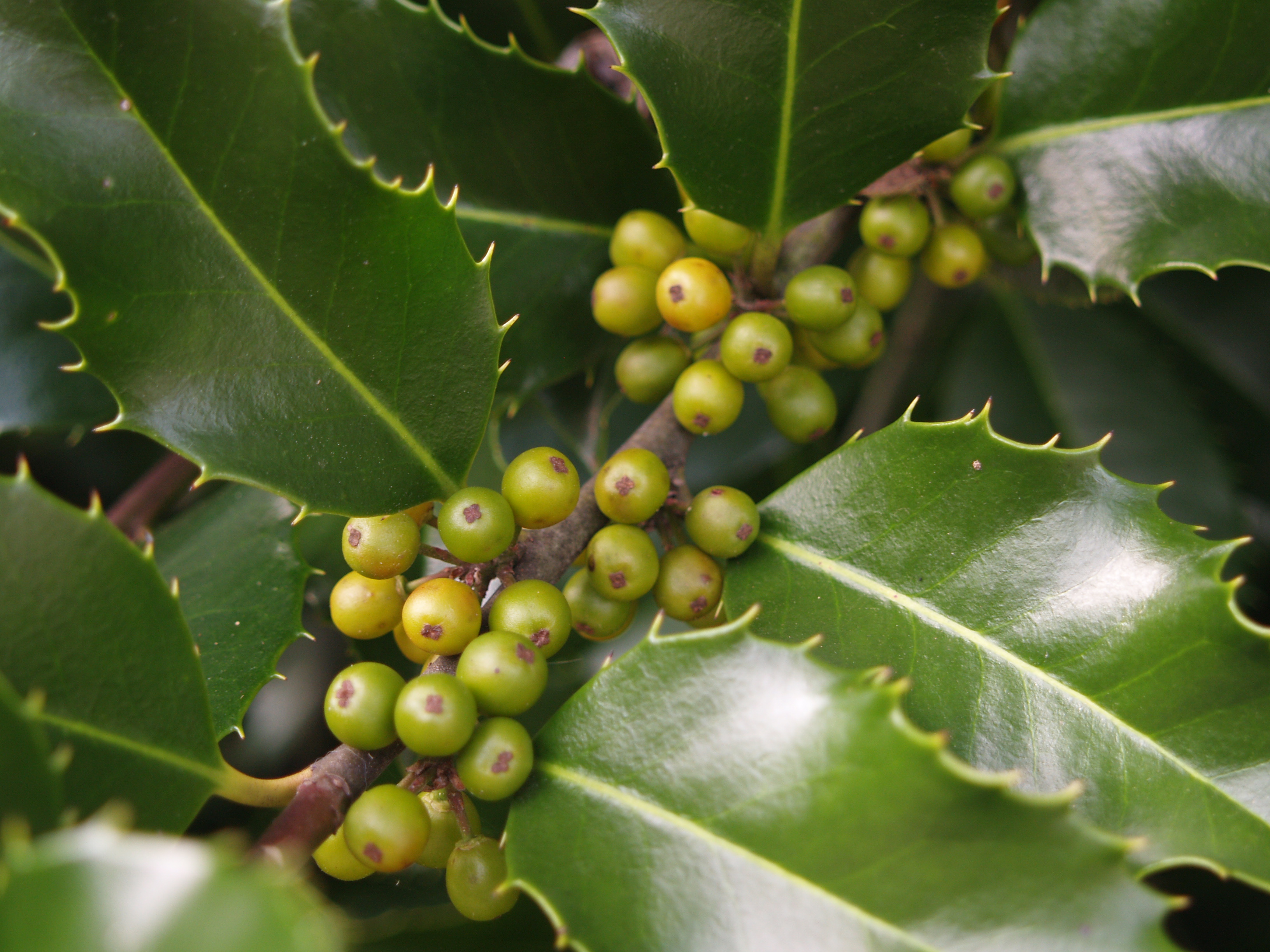 I have planted a variety of American, Chinese, English, and hybrid hollies in the garden, and most are heavily laden with berries this autumn. Many are still green (Koehneana holly, above), but others have ripened to red (a hybrid holly, below), and through the winter these will slowly disappear as birds eat them.